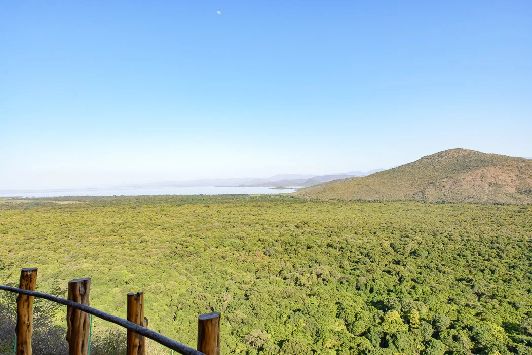 Ein zweiter Ausflug führt uns in den Nationalpark. Danakil-erprobt kann uns die holprige Piste nichts anhaben. In wildem Zickzack durchqueren wir God’s Bridge und genießen die Aussicht mal auf den einen mal auf den anderen See. Im flachen Teil stehen die hohen Bäume, die wir von unserer Terrasse aus sehen, mit geschlossenen Kronen und lichtem Unterholz. Hier treiben sich Affen herum und sonst nicht viel. Nach wildem Auf und Ab gelangen wir hinter den Berg, der uns von oben die Sicht versperrt. Hier öffnet sich eine kleine Savannenlandschaft mit Schirmakazien, Zebras und Gazellen in allen Größen. Räuber scheint es in diesem Paradis nicht zu geben.