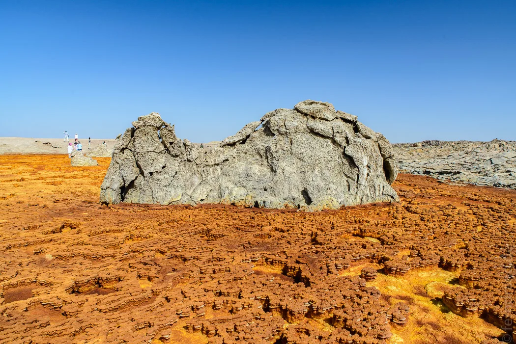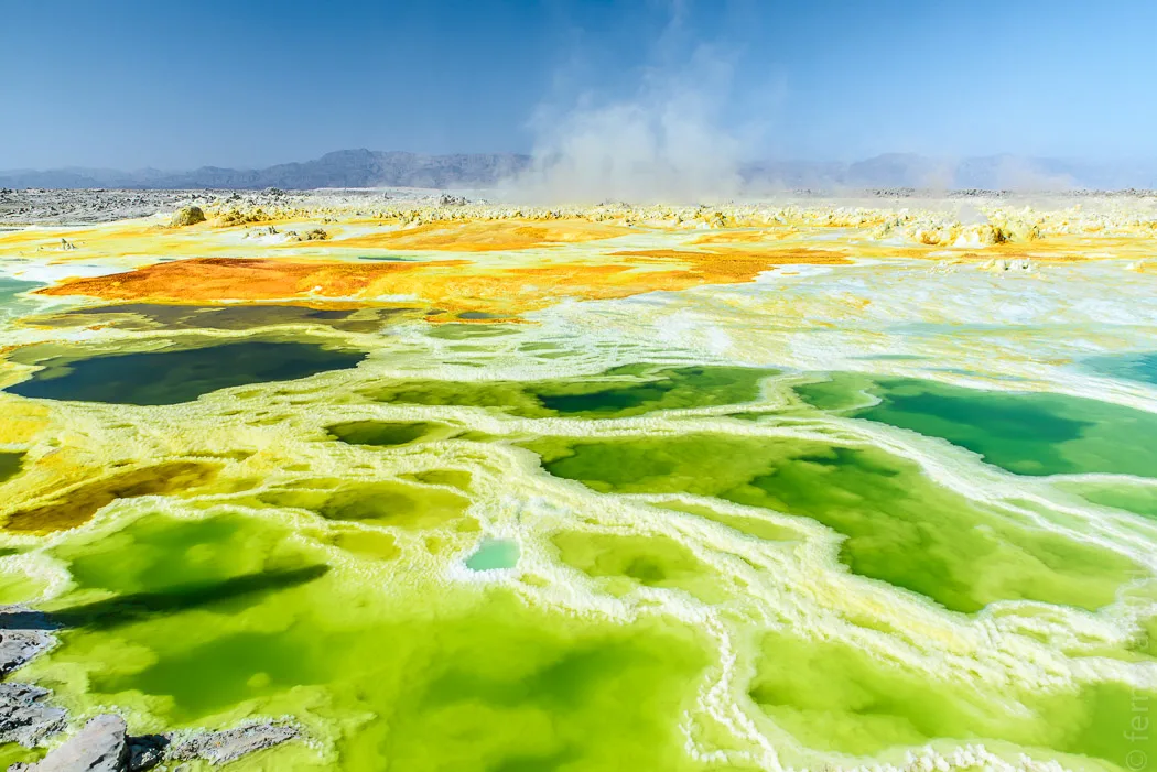 Auf Afar bedeutet Dallol “Auflösung”. Vielleicht, weil sich die Welt hier aufzulösen scheint? Oder vielleicht, weil sich allerlei unliebsame Dinge in den extrem sauren Pools auflösen lassen? Dies mag leicht einer der unwirtlichsten Orte der Welt sein. Das verrückte Farbenspiel und die wilden Strukturen wie pilzförmige Aufschwemmungen, erstarrte Kaskaden, kleine Schlote und blubbernde Becken muten geradezu außerirdisch unnatürlich an.
