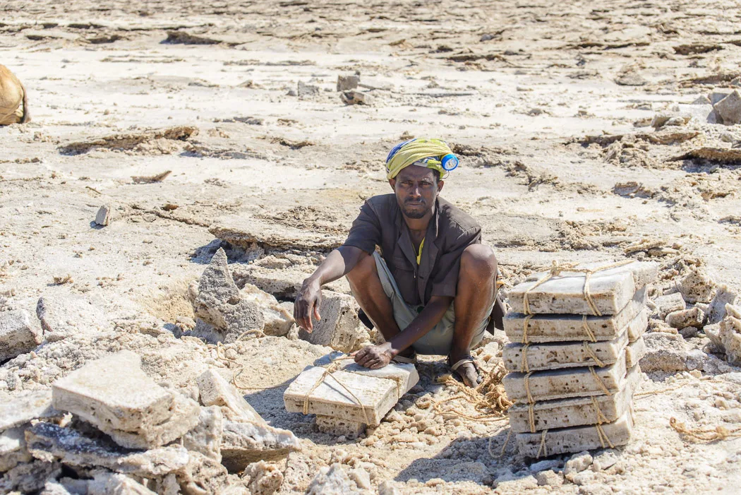 Auf dem Rückweg rückt das Salz in den Vordergrund. Aber es ist so heiß, dass man eigentlich nicht aussteigen möchte. Es gibt große Salzseen und einen Salz-Canyon, in dem zig Meter hohe, braun-weiß gestreifte Salztürme ausgewaschen wurden. Wir überfallen mit einem Haufen anderer Touristen eine Gruppe “Salzer” bei ihrer harten Arbeit. Eine andere Art von Hölle. Sie stemmen große Platten vom Boden und klopfen sie in eine Art flaches, transportfähiges Standard-Format. Die Kamele liegen noch bräsig dazwischen. Die kommen erst später an die Reihe.