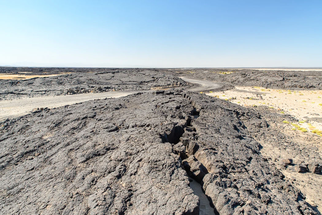 Anfangs gibt es noch neue Asphaltstraßen, die durch traurige Dörfchen führen. Die letzten 50km gehen aber querfeldein und kosten leicht vier Stunden oder mehr. Dabei ist der längere Teil auf Sand verhältnismäßig angenehm und schnell zu befahren. Hart ist sind die letzten 15km, die direkt über Lavagestein führen. Der Wagen fährt im Schritttempo und holpert extrem kurvenreich auf und ab, als würde man stundenlang über Bordsteine fahren.