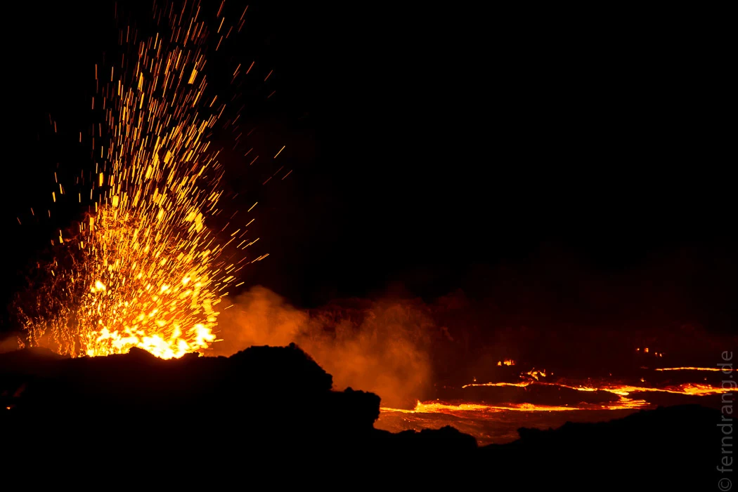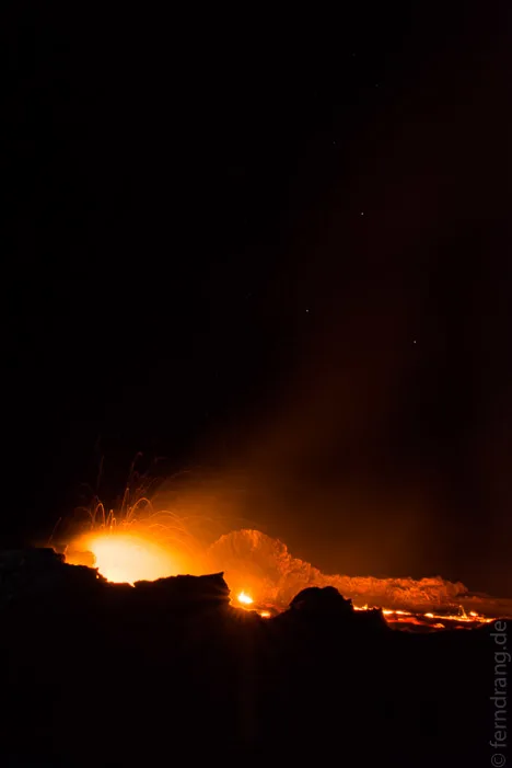 Der See ist fast voll. Die Lava brodelt einen Meter unter dem Rand vor uns. Oben drauf erkaltet sie und wird schwarz. Aber die Bewegung reißt die Decke immer wieder auf und lässt die glühende Lava orange aufblitzen. An den Rändern ist am meisten los. Hier spritzen Fontänen in die Luft, glücklicherweise meistens in die Mitte des 80m großen Sees. Hin und wieder spritzen kleine Klümpchen bis zwei Meter vor unsere Füße. Man ist der Naturgewalt hier gefährlich nahe. Doch es ist schwer seinen Blick von diesem unfassbaren Schauspiel zu reißen.