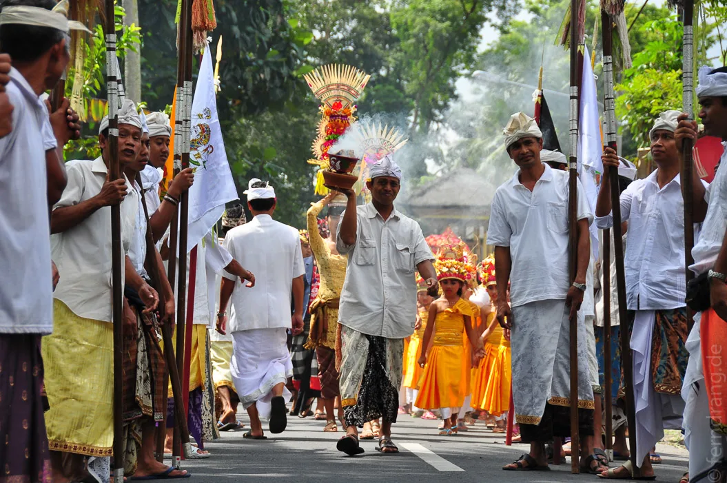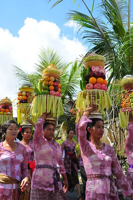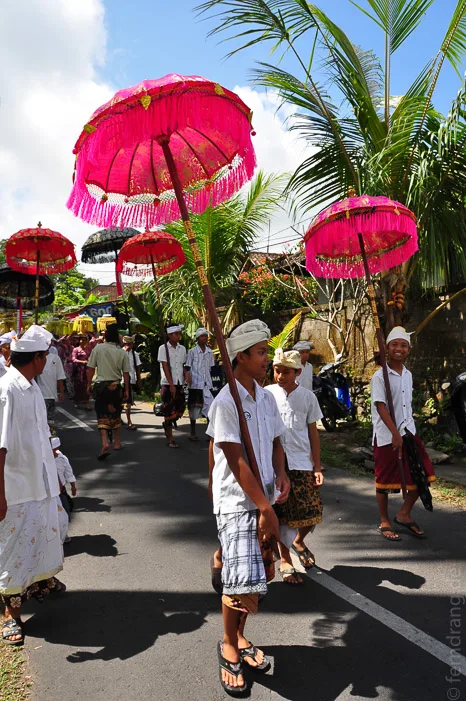 Heute haben wir uns wieder einen Roller gemietet. Wir wollten um jeden Preis verhindern, zu viel zu wandern. Ein paar Kilometer nördilch von Ubud sind wir aber auf einen geschäftigen Tempel gestoßen. Immer mehr Frauen haben auf den Köpfen Obstgestecke herangeschafft, und immer mehr Leute in Kostümen sind eingetroffen. Das ganze Dorf hat sich auf eine große Prozession vorbereitet. Es hat zwar ein paar Stündchen gedauert, bis alle fertig waren, dann war der Zug aber umso prächtiger. Die Schirmchenträger voran, gefolgt von kleinen, aufgebrezelten Mädchen, den kleinen Jungs, dicken Männern in Dämonen- oder wahlweise Seeräuberkostümen. Später kamen noch die Frauen des Dorfs nach Alter sortiert und zum Schluss die Kapelle mit tragbarem Gong. Wir haben das Spektakel genossen und sind auf Einladung auch ein Stück mitgelaufen.