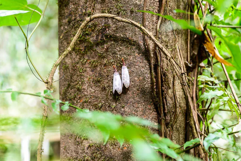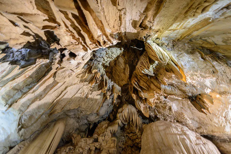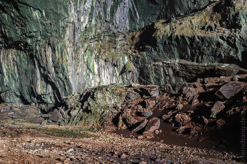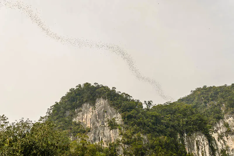 Die Wege zu den naheliegenden Höhlen führen sehr bequem ebenerdig über Holzplanken durch den Regenwald. Auf dem Weg sieht man schon die ersten interessanten Insekten und hört natürlich eine Menge von ihnen. Weniger interessante Insekten wie Moskitos sind leider auch in rauen Mengen zu erleben. Nach knapp einer Stunde gelangt man zur Deer Cave und zur Lang Cave, über deren Etymologie der Führer sehr langweilige Geschichten erzählt hat. Die Rekordhöhlen sind in der Tat ziemlich groß. Innen sind Stege und Treppen, die auf und ab durch zahlreiche Kammern führen. Die größere Deer Cave ist so breit, dass man darin ein Fußballfeld anlegen könnte. Das wussten die ca. 3-4 Millionen Fledermäuse allerdings zu verhindern, in dem sie den Höhlenboden in eine braune Mondlandschaft verwandelt haben. Dort, wo der Steg fast auf Bodenniveau kommt, brennen einem die Augen und der Ammoniakgeruch verschlägt einem den Atem (Rekord!). Am Ende der Höhle öffnet sich ein malerisches Regenwald-Panorama, das Garden of Eden genannt wird. Pünktlich zum Einsetzen der Dämmerung haben wir die Höhle verlassen. 60 Meter über uns taten die Höhlenbewohner das Gleiche. Ein Dichter, schwarzer Strang aus Fledermäusen schlängelt sich hier jeden Abend aus der Höhle quer über den Himmel, der über 20 Minuten nicht abreißt.