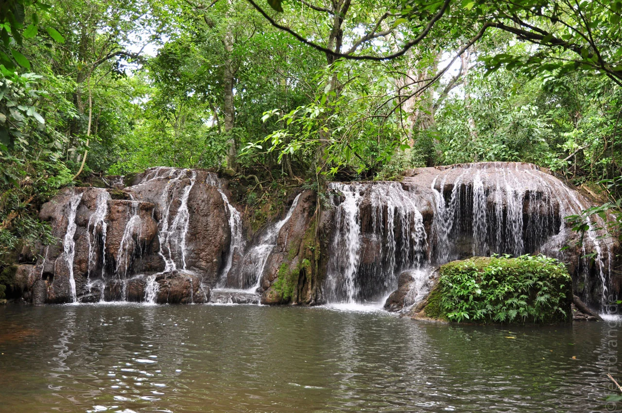 Als Ersatz haben wir den Besuch der Estancia Mimosa vorgezogen. Auf dem Gelände der Farm fällt der kleine Rio Mimosa in sieben malerischen Wasserfällen herab. Ein Wanderweg führt über Treppen und Stege am Fluss entlang. Auf dem Rückweg des kurzen Trips mussten wir an jedem zweiten Wasserfall baden - Tour ist Tour. Es gibt auch ein Gerüst für den obligatorischen 6m-Sprung in einen natürlichen Pool. Der Wald ist unheimlich schön.