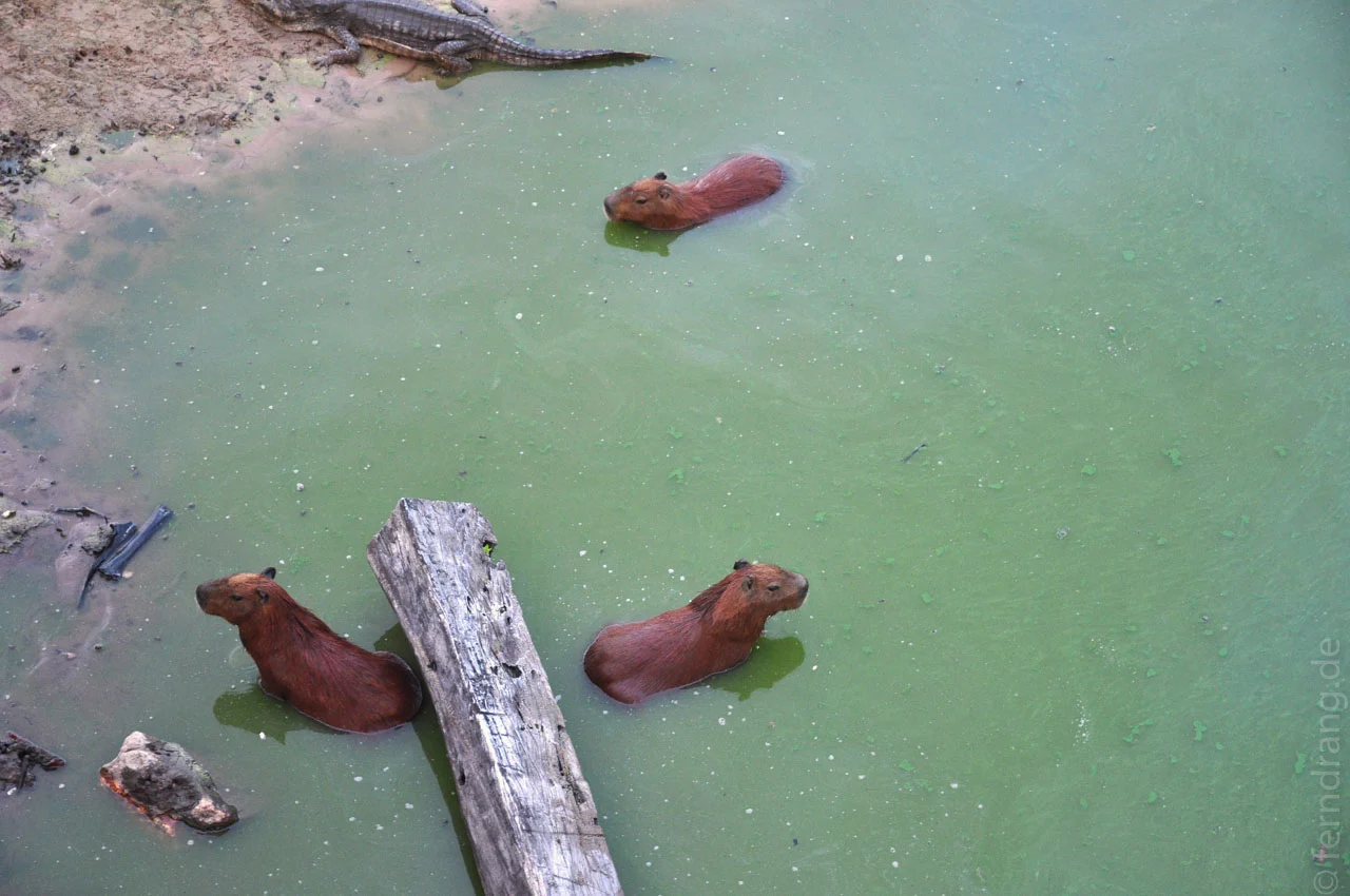 Jeden Tag stehen kleine Ausflüge auf dem Programm. Beim Busch-Spaziergang sind wir durch niedrige Palmenwälder gestreift. Schon morgens um neun Uhr ist die Hitze kaum erträglich. Beim Piranha-Fischen hat sich die beginnende Regenzeit gemeldet und uns trotz geliehenem Ölzeugs komplett durchnässt. Es ist erstaunlich wie schnell diese Viecher den Fleischhappen vom Haken fressen - da reichen Sekunden. Statt Fischen hatten wir nur die neugierigen Kaimane an der Angel.