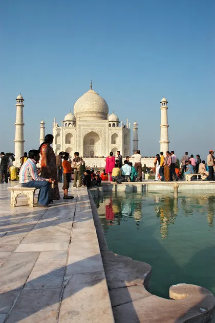 Unsere Unterkunft, die Shanti Lodge, hat ein Rooftop-Restaurant mit einem fantastischen Blick auf den Taj Mahal. Wir wollten ihn natürlich von nahem sehen, wurden aber von einer Schlange abgeschreckt, die fast bis an unser Hotel reichte. Glücklicherweise ist unsere dreiste Drängelattacke den Argusaugen der trillerpfeifenden Ordner entgangen. So konnten wir nach kaum zehn Minuten mit zigtausenden, hübsch hergerichteten Indern in der Parkanlage lustwandeln. Der Anblick des marmornen Wunderwerks ist atemberaubend. Wir kamen aber nur langsam voran, weil sich dauernd wahnsinnige Inder ausgerechnet mit uns fotografieren lassen wollten.