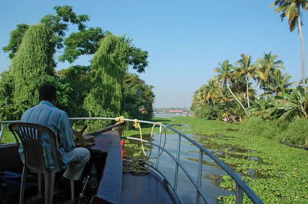 Die äußerst geschäftstüchtigen Kerle des Gowri Hotels “can arrange everything”. Da wir die Backwaters und das zauberhafte Alleppy zu Fuß nicht gefunden haben, war der nächste Versuch ein Kanuausflug. Und tatsächlich, nachdem wir uns an einer nicht enden wollenden Reihe vertäuter Hausboote haben vorbei rudern lassen, wurden wir schon von den Kanälen und Seitenkanälen und Seitennebenkanälen verschluckt. Die Ufer sind alle befestigt und mit vielen kleinen Häuschen besetzt, vor denen jeweils uralte Inder sitzen und dabei zusehen, wie weniger alte Inderinnen am Kanal den Abwasch machen.
