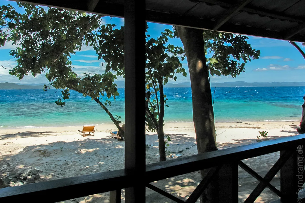 Unsere Hütte ist (wie alles hier) nur zehn Schritte vom Meer entfernt und hat eine schöne Veranda, auf der man sich vor der Sonne verstecken kann. Das Bad liegt dahinter im Freien, so dass man unter Bäumen duschen kann. Wir haben sogar eine Klimaanlage. Der Gesamteindruck entspricht erfrischend wenig einer Pauschalreise. Den Rest des Tages haben wir mit verspäteter Urlaubseinstimmung und Sonnenbrandkriegen verbracht.