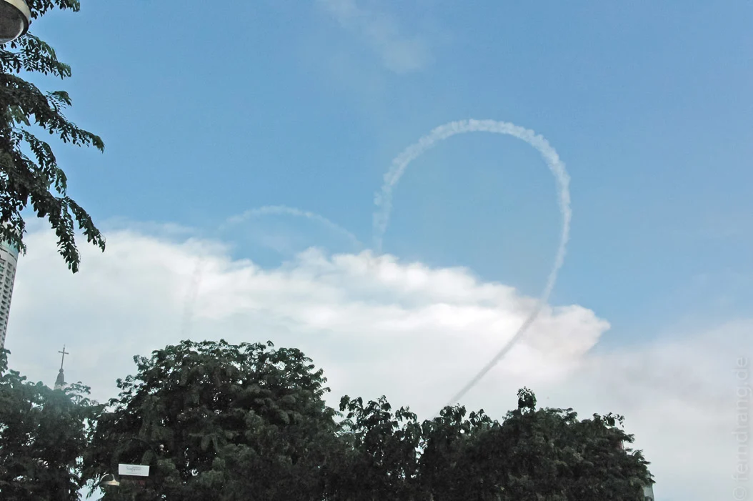 Nach einem kulturellen Abstecher ins Singapore Art Museum wurden wir von einer wilden Flugshow überrascht. Fünf Kampfjets sind im Tiefflug über die Stadt gedonnert, um grauenhafte Formationen vorzuführen und dabei Kondensherzen, -kreise und -streifen herzustellen. Offenbar kam Ramstein nur in den Lokalnachrichten.