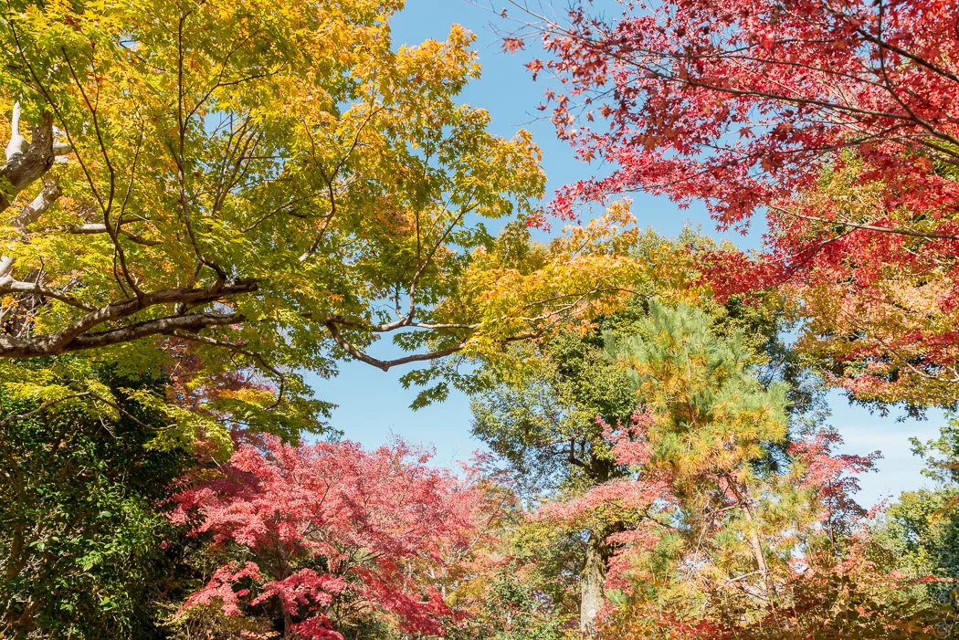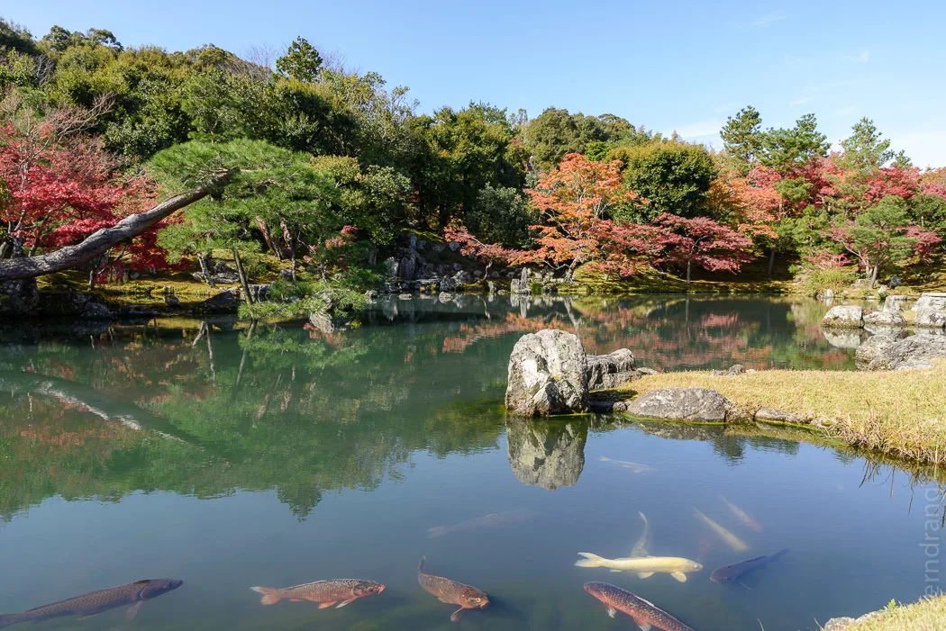 Auf dem Rückweg vom Berg tauchte unverhofft ein nettes Café auf, wo wir unser Frühstück nachholen konnten. Stärkung für die Fahrt zum westlichen Stadtrand, wo der Garten des Tenryu-ji Tempels das perfekte Herbstpanorama eines Japans in Miniaturform bot: Knallrote Ahorne, die ihre knorrigen Arme flach über einen Weiher streckten, ein bunter Laubwald auf einem kleinen Hügel, geharkter Kies, hier und da ein Felsen und sogar Bambus. Eigentlich fehlte nur noch Schnee. Der Garten liegt in seiner Pracht vor der langen Veranda des Tempels. Man kann sich schon vorstellen wie erbaulich die Mönche hier meditieren konnten. Falls hier überhaupt Askese angesagt war, dann galt das wohl weder für Ästhetik noch für Gartenarbeit.