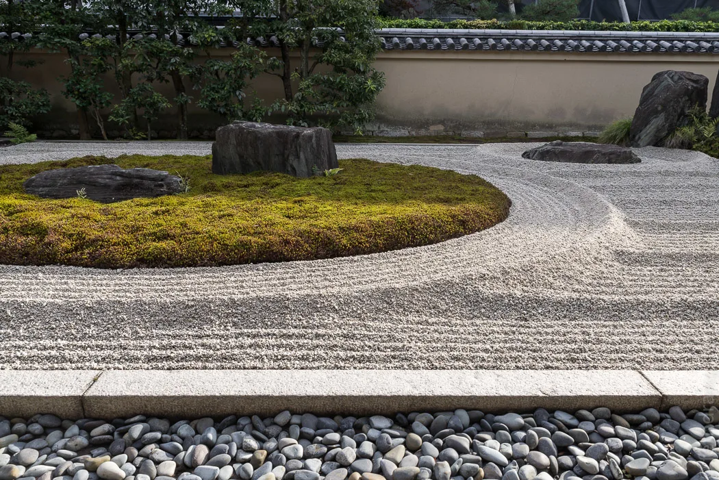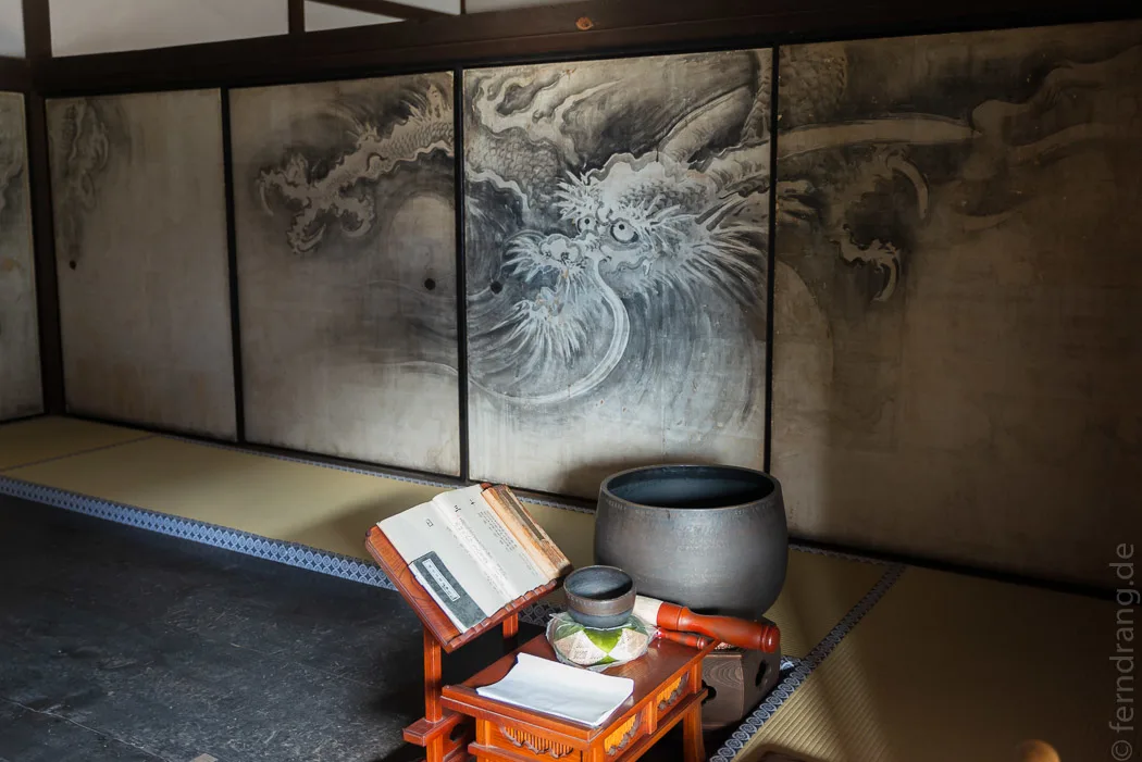 Etwas weiter gibt es eine Kolonie von Zen-Klöstern. Das große Gelände ist hauptsächlich mit kleineren, unabhängigen Klöstern vollgestopft, die ein eingemauertes Zen-Dorf bilden. Hier haben wir einige der berühmten Steingärten angeguckt. Meistens sind es Wellenmuster, die von größeren Steinen ausgehen, wie Tropfen im Wasser. Im Inneren der Klöster gibt es nichts zu sehen. Die Tatami-Zimmer unterschieden sich kaum von denen in unseren Ryokans. Wir hatten zwar keine mit Drachen bemalten Wandschirme aus dem 17. Jahrhundert, dafür aber Teekocher und Heizung.