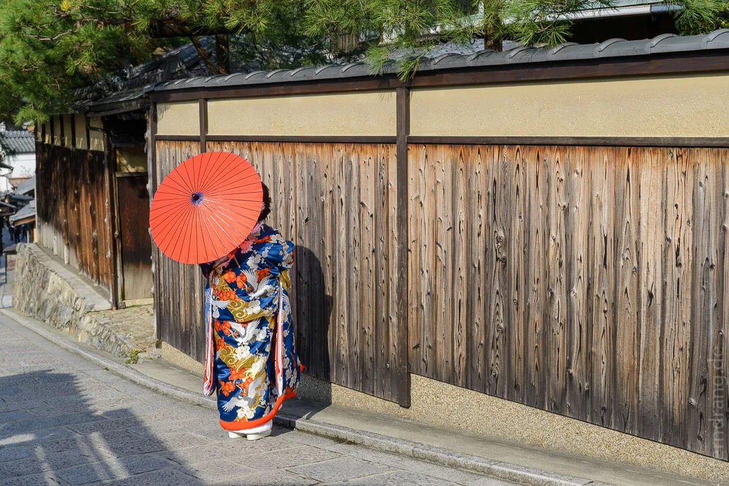 Im benachbarten Viertel Gion geht es etwas geheimnisvoller zu, denn hier sind die Geishas. In den ruhigen Nebenstraßen gibt es traditionelle und sehr diskrete Teehäuser. Wir hätten sie gar nicht erkannt, wenn nicht hinter uns, tap tap tap, eine Geisha in vollem Ornat aufgetaucht und zielstrebig in einem unscheinbaren aber stilvollen Haus verschwunden wäre. Die Kunden, meist ältere Herren, kamen etwas zeitversetzt im Taxi an. Auch wenn sich Touristen in den Gassen herumdrücken und mit Kameras regelrecht auf die Lauer legen, wirkt es hier sehr japanisch und sehr verschlossen.
