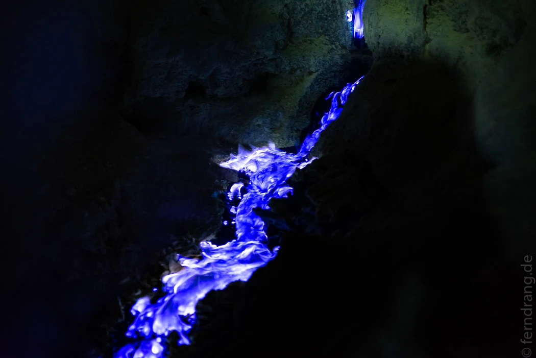 Im dunkeln konnten wir den extrem sauren See gar nicht erkennen, an dessen Ufer die Schwefelmine liegt. Das berühmte Blaue Feuer brodelte überirdisch blau am Hang. Zwischendurch löschen die Arbeiter das Feuer. Aber die verflüssigten Schwefelgase entzünden sich an der Luft immer wieder von selbst. Vor Jahrzehnten haben Waghalsige dicke Rohre verlegt, die das heiß austretende Schwefelgas auffangen und umlenken. In den Röhren kondensiert das Schwefelgas und wird in wild rauchenden Tonnen aufgefangen. Die Gasmasken haben sich dort dann doch als sehr hilfreich erwiesen. Der flüssige Schwefel ist noch dunkel-orange bis er zu grellgelben Brocken erkaltet, die von den Arbeitern mit einer Brechstange herausgeschlagen werden. Dieser industrielle Touch macht den ohnehin schon eigenartigen Ort endgültig zu einer kleinen Hölle.