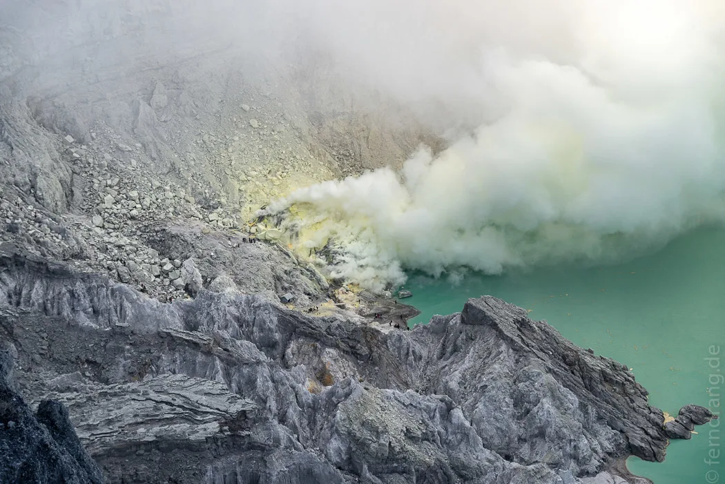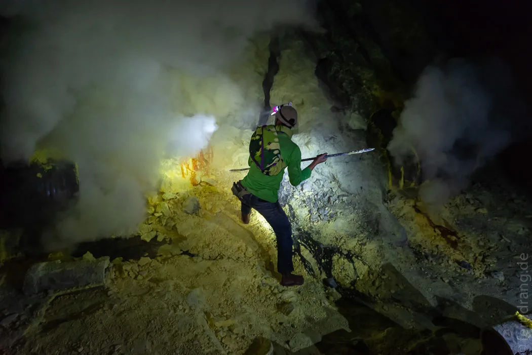 Mit tränenden Augen haben wir den steilen Pfad ertastet. Immer wieder sind uns Minenarbeiter mit ihrer unnatürlich gelben Last entgegen gekommen. Der Schwefel liegt in zwei Körben, die an einer Stange befestigt sind. Mit bis zu 80kg auf den Schultern kämpfen sich die Arbeiter in Gummistiefeln nur mit einem Tuch vor dem Mund aus dem Krater heraus. Viel schlimmere Arbeitsbedingungen kann es kaum geben. Ich werde beim nächsten Mal daran denken, wenn im Büro die Milch ausgeht.