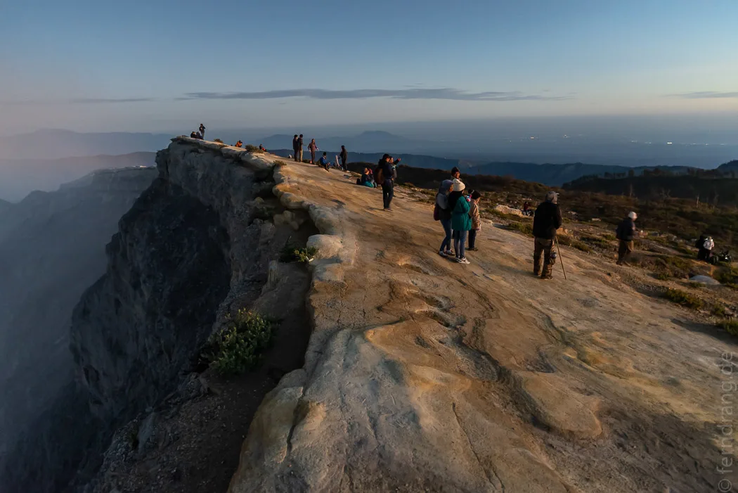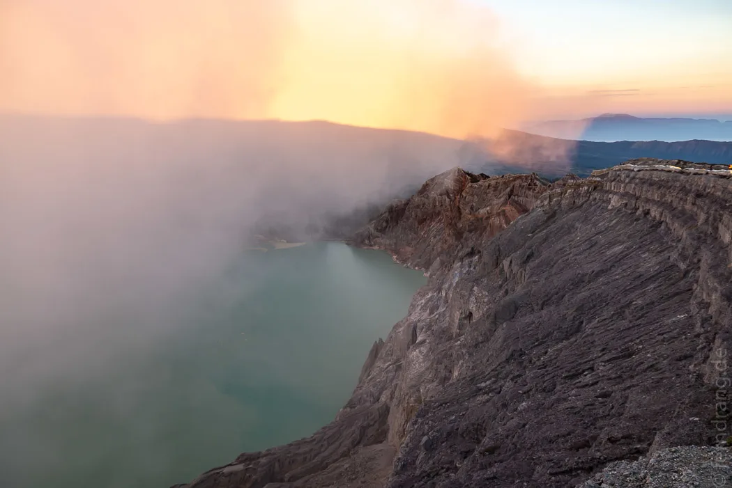 Zum Himmel war es von dort aber nicht weit. Wir waren extra schnell gegangen, um Zeit zu haben zum Sonnenaufgang am anderen Ende des Kraterrands zu sein. Als sich der Tag dann mit grünen Farben vorsichtig ankündigte, und kurz später die Landschaft in zartem rosa erblühte, schien nichts ferner als eine fiese, kleine Schwefelmiene.