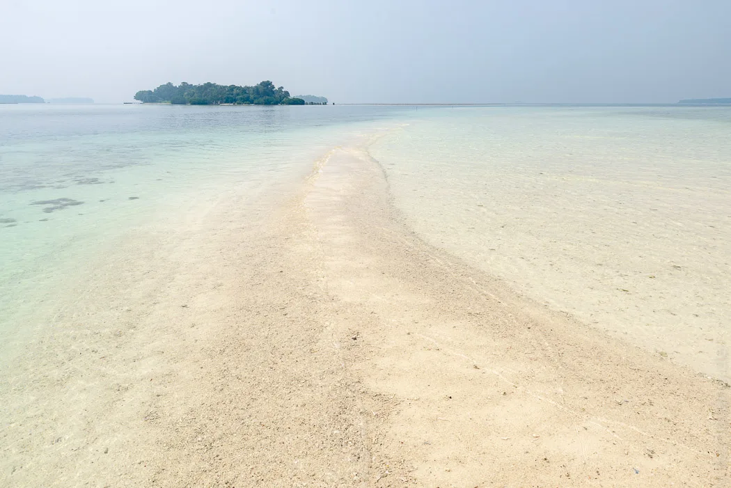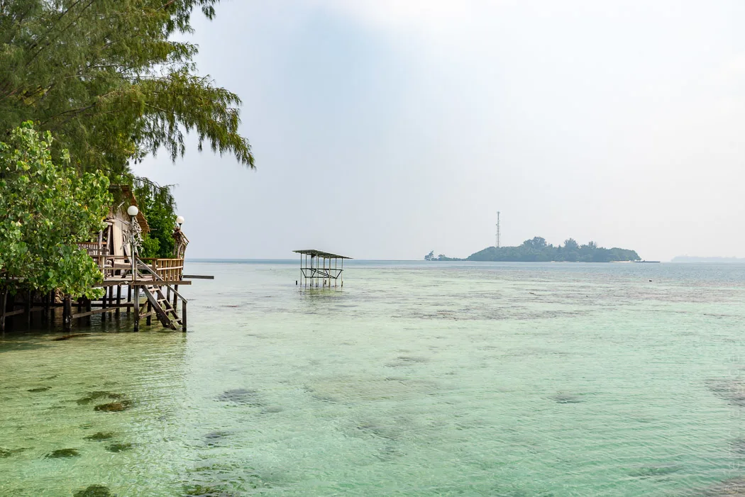 Unser Ziel war Pulau Macan. Dort gibt es nur wenige Hütten, die sich das Inselchen mit einem Waran teilen. Eine Umrundung über die stets frisch gerechten Trampelpfade dauert keine fünf Minuten. Ringsum liegt ein dutzend weiterer schwimmender Wäldchen in Sichtweite. Unser „Zimmer“ ist eigentlich nur ein Holzgerüst, einen Meter über Wasser, das zum Meer hin offen ist und zu den restlichen Seiten mit Tüchern etwas Privatsphäre bietet. Wir hatten einen wunderbaren Blick über das knietiefe Wasser der Lagune.