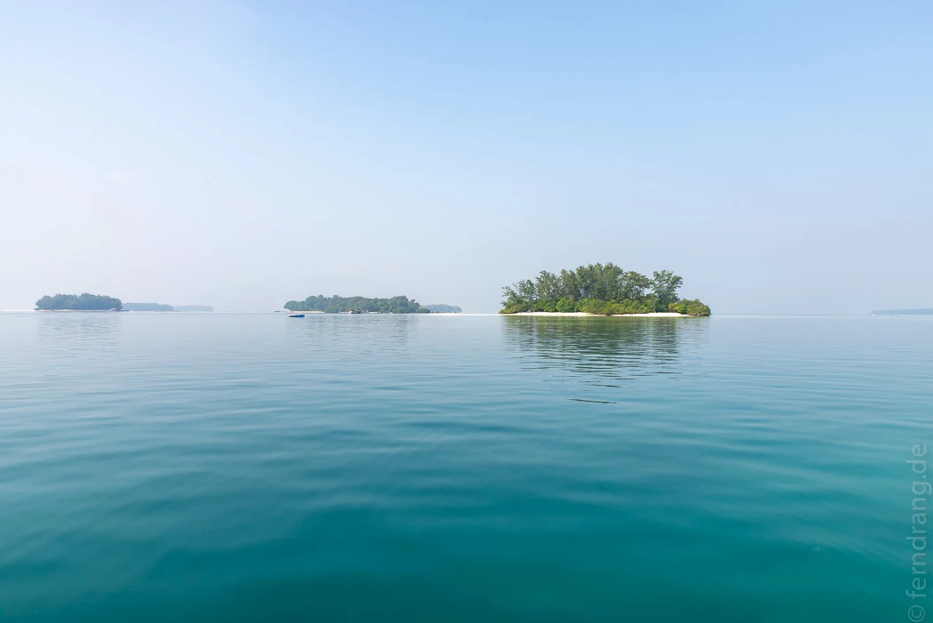 Um den Erholungsaspekt des Urlaubs von vornherein nicht zu vernachlässigen, haben wir einen Ausflug zu den Thousand Islands unternommen, die nördlich von Jakarta in der Javasee liegen. Eigentlich sind es nicht annähernd 1000, aber ein paar Hundert kleine Inselchen sind es schon. Von der Marina Ancol, einem gut organisierten Bootssteg in einer erwartungsgemäß tristen „Freizeitanlage“ am verbauten Ufer Jakartas, dauert die Überfahrt mehr als zwei Stunden. Aber die See ist ruhig und die fünf 200 PS Außenborder haben uns schnell außer Sichtweite der Megastadt gebracht. Schon bald flogen die ersten Eilande an uns vorbei. Die meisten sind keine 100m lang und bestehen nur aus Bäumen. Einige wenige etwas größere, von weitem an den Handymasten zu erkennen, beherbergen kleine Dörfer.