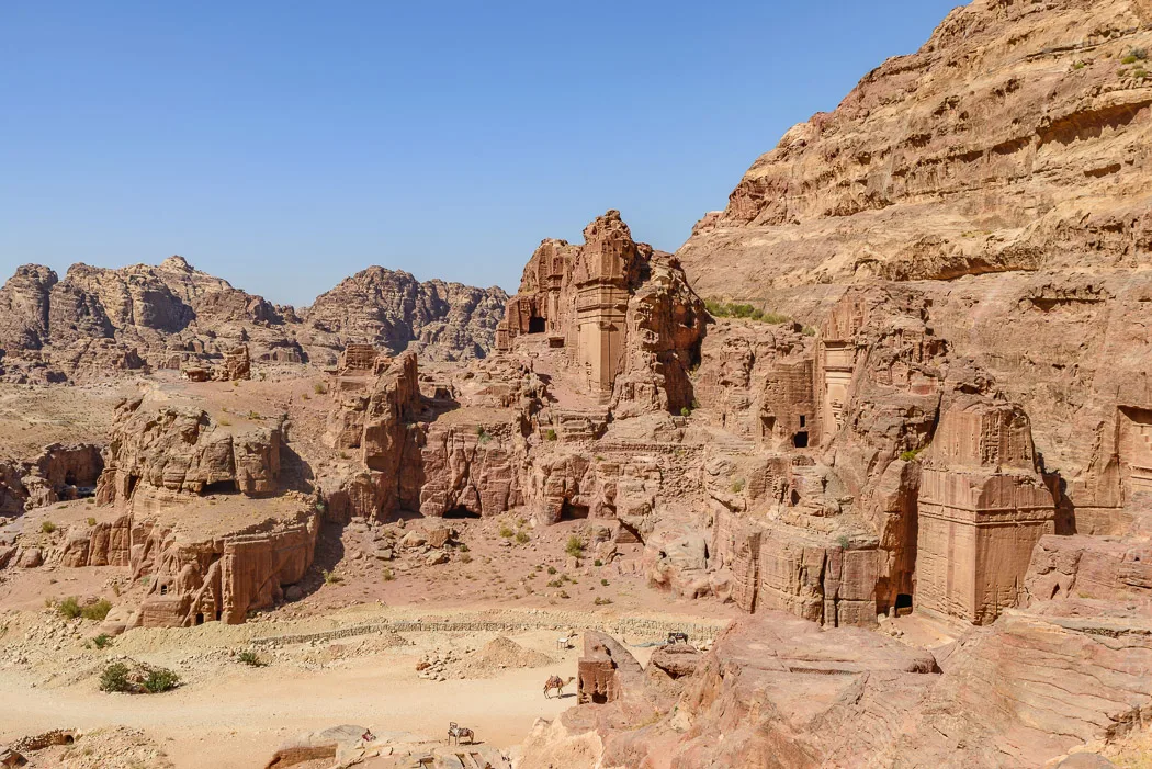 Dahinter führt die Schlucht noch ein Stückchen weiter, bevor sie in ein breiteres Tal mündet. Hier stehen Unmengen von Grabmälern, von denen jedoch keines so gut erhalten oder so schön gestaltet ist wie das Schatzhaus. Wir steigen zuerst endlose Treppen hinauf zu einer Opferstätte. Die Nabatäer hatten offenbar keinen sonderlich guten Draht zu ihren Göttern, so dass sie häufig zu Tieropfern greifen mussten. Sie haben sogar extra Blutrinnen angelegt, wahrscheinlich damit die Sauerei nicht die Treppen herunter fließt, die sie mühselig in den Berg gehauen haben. Von oben hat man einen guten Blick über das weitläufige Gelände.