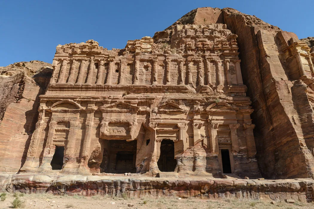 Der Anblick der vollen Fassade ist überwältigend. Das aus dem Fels gehauene Grabmal ist ein wilder stilistischer Mischmasch. Obwohl es an die 2000 Jahre her ist, dass die Nabatäer hier Hammer und Meißel in die Hand genommen haben, sieht das Grabmal aus als sei es erst gestern erst aus dem zart orange-rosafarbenen Sandstein gehauen worden. Es sieht so neu aus, dass wir an seiner Echtheit zweifeln – das hat man von guter Qualität. Tatsächlich wurde hier auch einiges instand gesetzt aber der Ort ist auch vor Witterung gut geschützt.