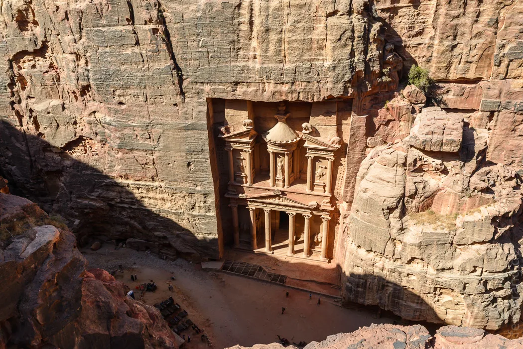 Beim zweiten Besuch von Petra sind wir extra früh aufgestanden, um das Schatzhaus in der Morgensonne leuchten zu sehen. Dafür waren wir aber zwei Stunden zu früh, so dass wir noch Zeit hatten, auf den gegenüberliegenden Berg zu steigen. Mit etwas Kraxelei kommt man zu einem tollen Aussichtspunkt mit unversperrtem Blick von oben, während sich unten schon Kamele und Touristen gegenseitig im Weg stehen. Beim zweiten Frühstück ist die Sonne endlich über die Fassade gezogen.