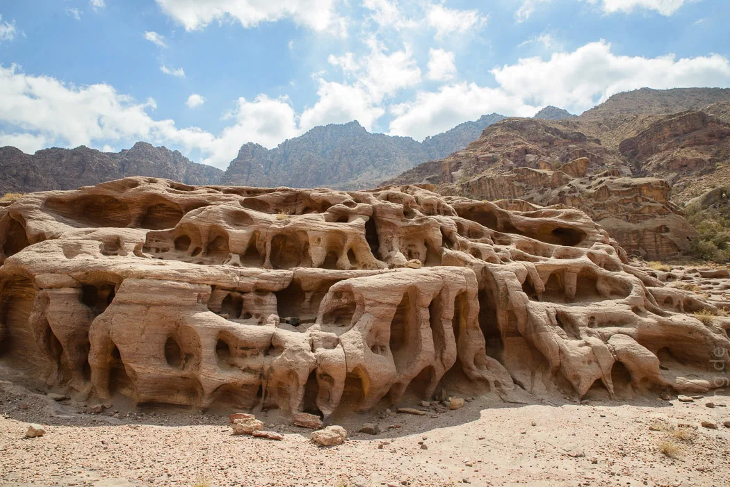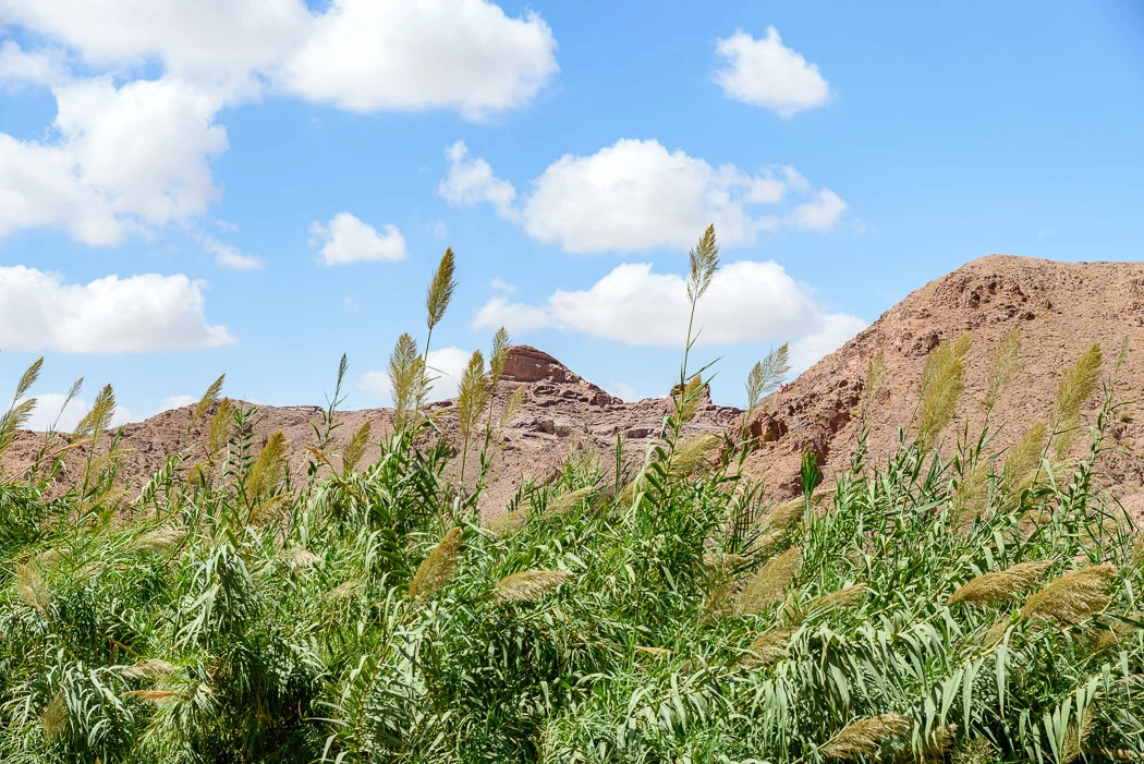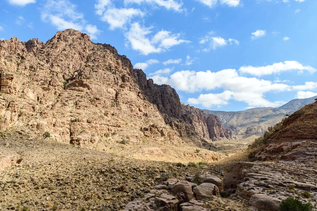 Zur Abwechslung bleibt das Auto heute mal im Schatten stehen und wir gehen zu Fuß los. Direkt hinter unserem Hotel schlängelt sich ein Weg in das Wadi Dana hinab. Die Wanderung durch das wunderschöne Tal ist zwar 16km lang, davon geht es aber kaum einen Meter bergauf. “Talwandern” geht aber ziemlich in die Knie, besonders wenn es wie im ersten Stück steil bergab geht. Von beiden Seiten wird unser Weg von wilden Klippen flankiert, die in immer wechselnden Formen und Farben zur Talmitte auslaufen. Nach ein paar Stunden wird es etwas grüner im Tal. Der Fluss ist zu dieser Jahreszeit zwar ausgetrocknet, aber sein Bett ist dennoch von hohem Schilf und blühendem Oleander gesäumt. Später treffen wir auf einige Beduinen mit ihren Herden.
