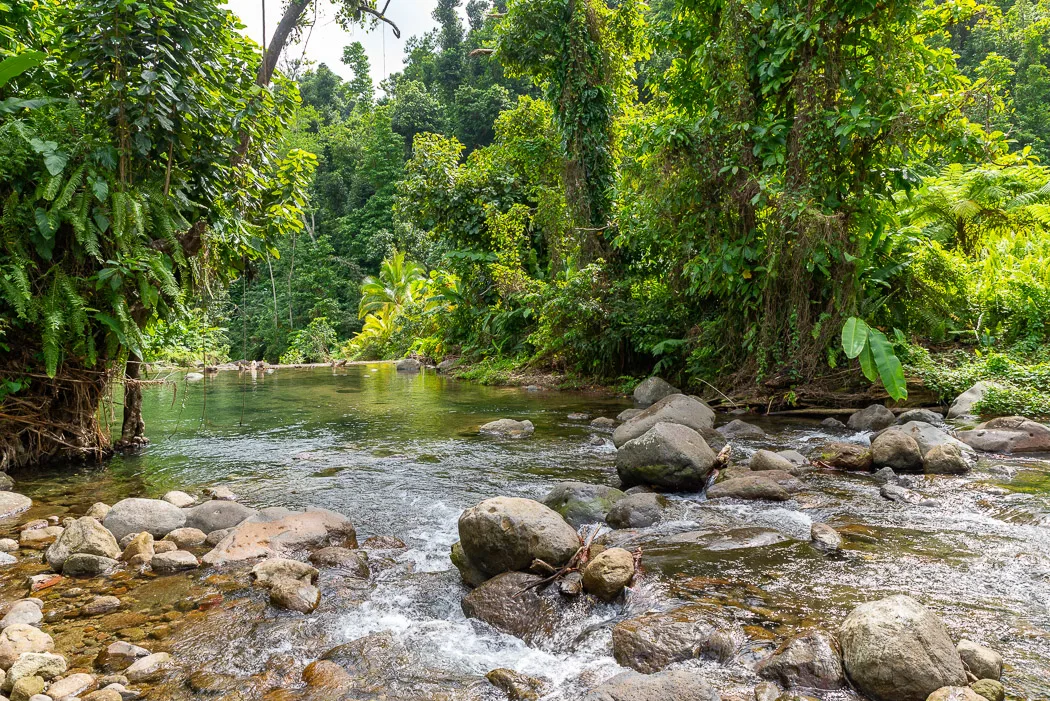 In der Umgebung gibt es einen Fluss, den man entlangwandern kann. Schon beim ersten Ausflug mussten wir lernen, dass man auf Dominica niemals trocken bleibt. Alle Wanderwege scheinen früher oder später durch einen Fluss zu führen. Unsere Wanderschuhe sollten erst auf der nächsten Insel wieder trocken werden.
