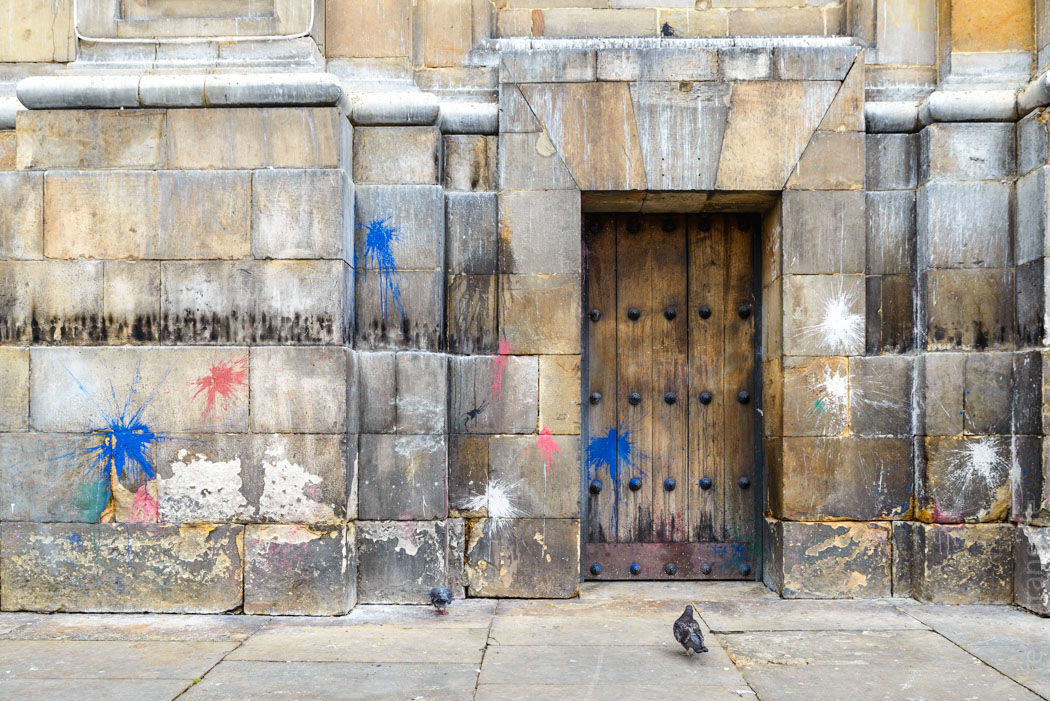 Nach ein paar Stunden Schlaf lassen wir uns das Frühstück auf die hübsche kleine Terrasse bringen. Den Tag lang streifen wir durch Candeleria, der Altstadt von Bogota. Kontinenttypisch erstreckt sich ein Schachbrettmuster kleiner Straßen um die prächtige Plaza Bolivar. Die Häuser sind allesamt alt, und in unterschiedlichem Grad sieht man es ihnen auch an. Dazwischen nehmen hin und wieder alte Kirchen einen Block ein. Auf der Talseite der Plaza erstreckt sich der Regierungsbezirk. Hier sind die Bürgersteige von Soldaten und die Eingänge von der Ehrengarde mit tollen Uniformen bewacht. Hinter den Zäunen sieht man prächtige Villen und Gärten, die leider nicht zugänglich sind.