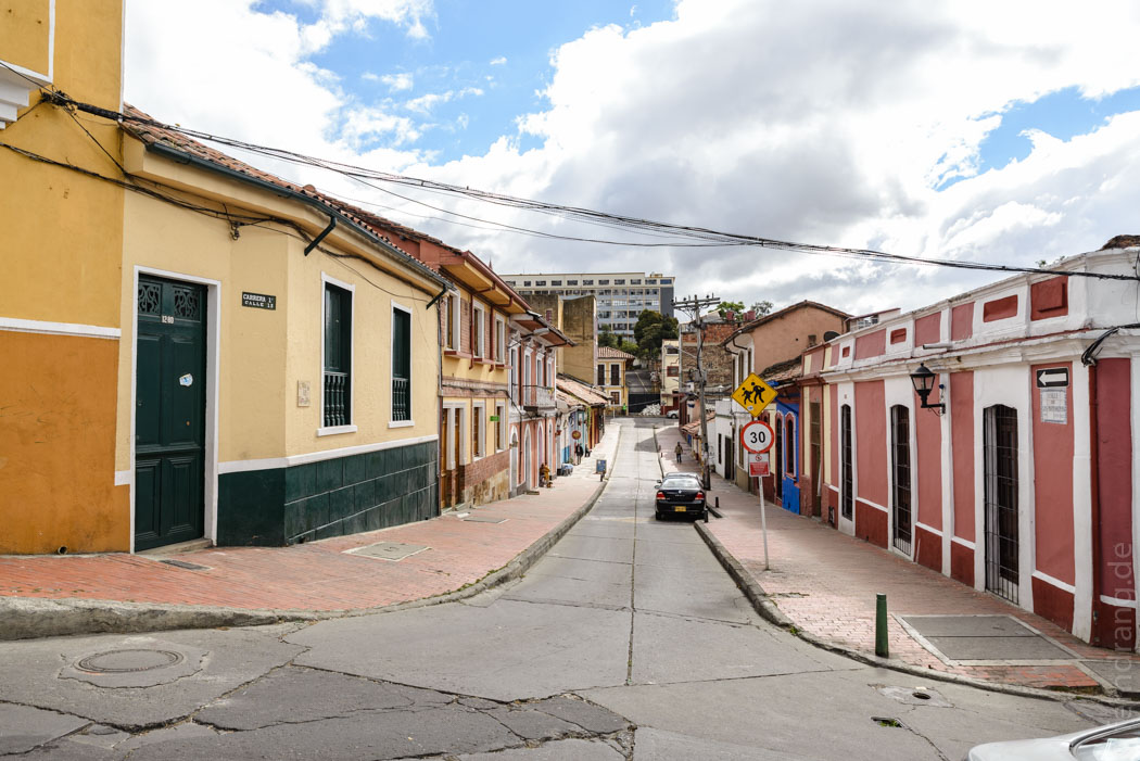 Gegen drei Uhr nachts sind wir in Bogota gelandet. Der Taxifahrer rast durch leere Straßen. Die Bebauung rund um den Flughafen ist sehr modern, auch die Straßen machen einen guten Eindruck. Je mehr man sich der Innenstadt nähert, desto mehr ändert sich das. Dort sind viele ältere und auch heruntergekommenere Häuser. Unser Guesthouse “Arche Noah” liegt im alten Bezirk “La Candeleria” am Hang. Die Zimmer liegen hinter alten Türen um einen Patio und sind modern und praktisch ausgestattet. Wir fallen heute aber nur noch tot ins Bett.