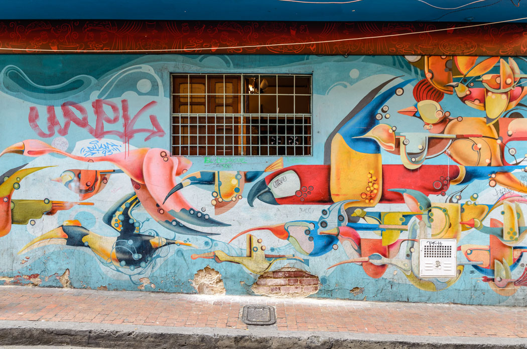 Anschließend haben wir uns in einen ganz anderen Teil Bogotas aufgemacht. Mit dem Transmilenio, Bogotas Vorzeige-Bussystem, sind wir Richtung Norden gefahren. Der Transmilenio hat seine eigene Spur und steckt daher nicht im Stau. Die Hauptstraßen haben daher zum Teil acht oder mehr Spuren. Auf dem Weg bekommt man an den Wänden der Stadtautobahn eine Graffiti-Ausstellung umsonst dazu. Ein Kunstwerk reiht sich über Kilometer ans nächste. Später werden wir in der Zona G ausgespuckt, wo das teure und moderne Bogota liegt. Der Parque 93 ist von schicken Restaurants gesäumt und wimmelt in der Mittagszeit von den Angestellten der Umgebung. Hier scheint nicht nur jeder Arbeit zu haben, sondern auch die Gelegenheit sein Geld wieder loszuwerden. Weiter südlich schließt sich die Zona Rosa an. Hier wird geshoppt. Neben der dicken Edel-Shopping-Mall liegt eine Fußgängerzone mit Mode und schicken Restaurants bis zum Abwinken. Hier ist keine Spur vom armen Kolumbien – Düsseldorf meets Ipanema.
