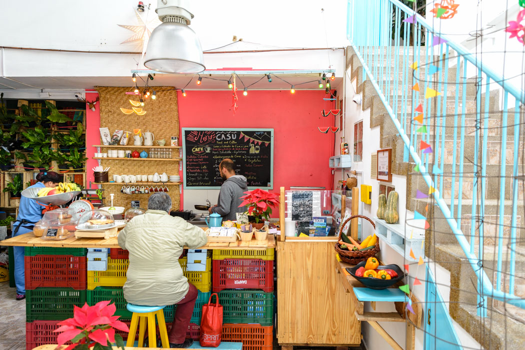 Wir haben endlich mal genug geschlafen und den Tag in einem niedlich eingerichteten Café um die Ecke begonnen. Das gesamte Interieur ist aus Kisten und Paletten selbst gemacht und wild angestrichen. Die gut gelaunte Wirtin stört sich nicht an unseren Spanischkenntnissen und vermeidet kurze, einfache Sätze.