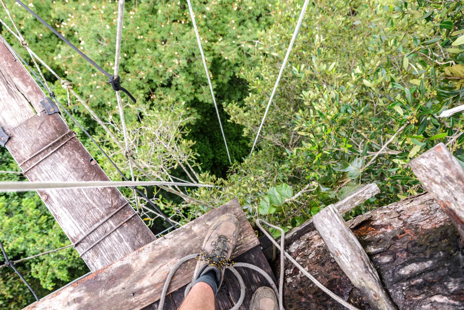 Die Nacht über hat es wieder fast durchgehend geschüttet. Wir haben unsere Matratze leicht verschoben, um nicht unter dem Loch im Dach zu liegen. Zum Morgen hin hört der Regen auf. Stattdessen berieselt uns der Hauspapagei, der Hahn des Regenwalds, ab Sonnenaufgang mit seinen Krächzereien. Am Vormittag haben wir eine Canopy-Tour gemacht. Wir waren zwar schon öfters auf Hängebrücken in Baumkronen, aber hier musste man selbst an einem Seil hochklettern. Das geht bei 40m natürlich nicht ganz ohne Hilfe. Mit Seilbremsen und Fußschlaufen haben wir uns raupenartig das Seil hochgearbeitet. Oben hat man einen schönen Blick über den endlosen Wald. Hinter einer wackligen Brücke haben sie noch ein Drahtseil gespannt, an dem man zum nächsten Baum sausen kann.