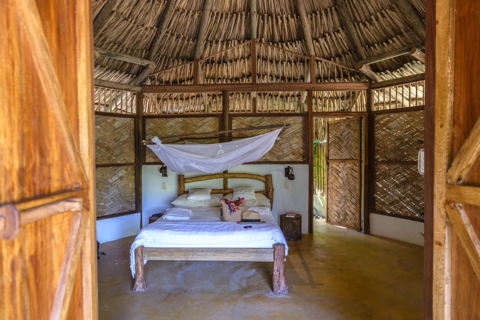 Genug Cartagena. Auf nach Palomino! Das kleine Örtchen liegt weiter östlich an der Küste und verspricht tolle Strände und Nähe zum beliebten Nationalpark “Tayrona”, wo man zu den noch schöneren Stränden wandern muss. Auf dem Papier war das ein Katzensprung, der in etwa 4 Stunden zu schaffen sein sollte. In der Realität haben wir die doppelte Zeit gebraucht, drei mal den Bus gewechselt und sind zuletzt, längst im Dunkeln, von Motorrad-Taxis irgendwo im Busch abgesetzt worden. Mit Taschenlampen haben wir erstmal andere Gäste erschreckt, die wir für die Rezeption hielten. Letztlich sind wir fündig geworden und haben es uns in einer sehr schönen und großen Hütte im weitläufigen “La Sirena” gemütlich gemacht. Hier ist auch alles Eco. Aber hier äußert sich das durch gelungenes Naturdesign der Einrichtungen, eine ziemlich verrückte Kompost-Toilette und (freiwillige!) Yoga-Kurse.