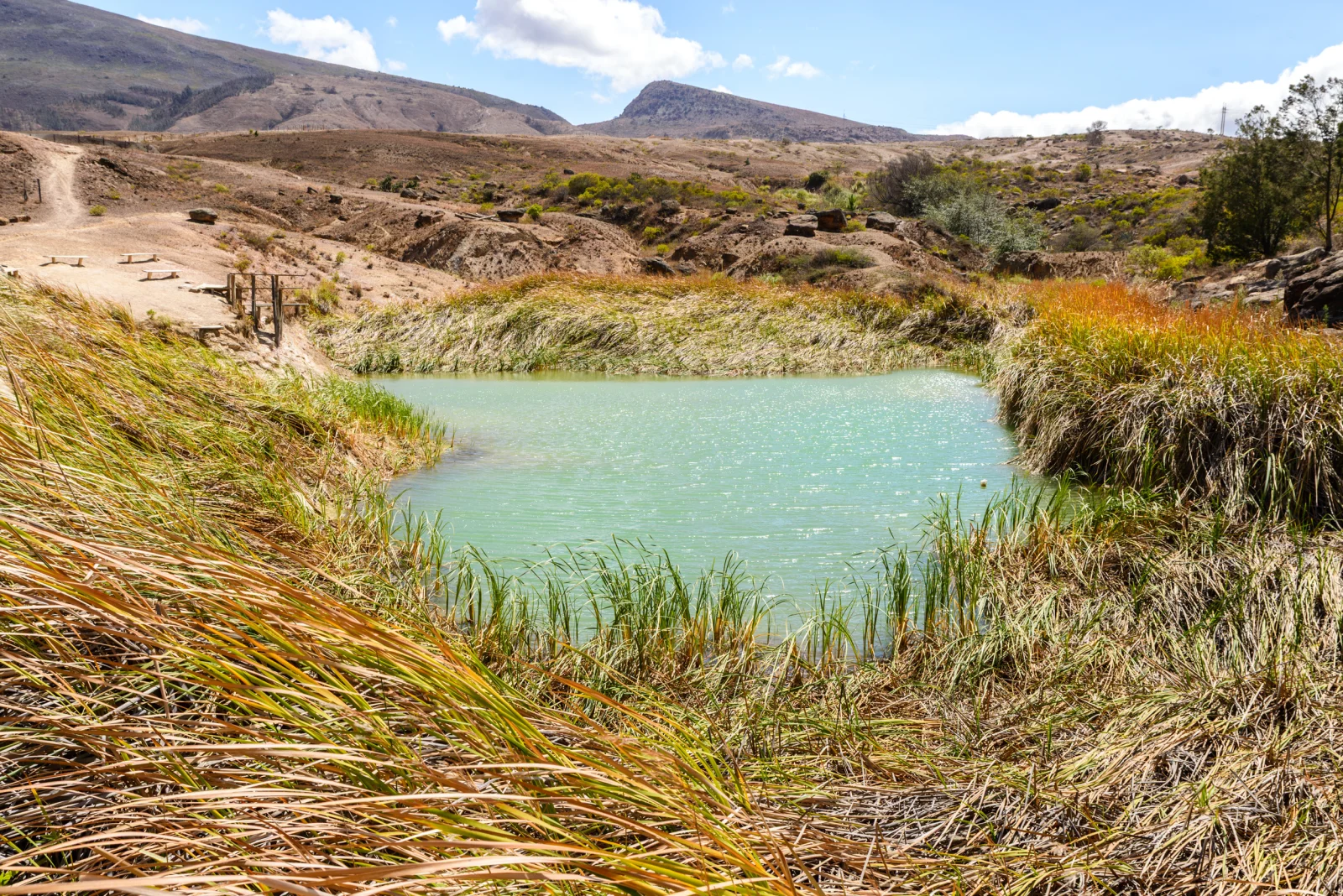 Ganz faul wollten wir das Jahr nicht ausklingen lassen. Daher sind wir zu den “Posos Azules”, türkis-blauen Tümpeln, gegangen. Der Weg führt aus der Stadt hinaus in einen kargen, wüstenhaften Teil des Tals, das überall malerisch mit Stacheldraht in gleich leere Parzellen geteilt wird. Kein Mensch ist hier unterwegs, und nach einer Weile kommt einem automatisch das “Lied vom Tod” in den Sinn. Ganz einsam sind wir aber nicht geblieben, weil immer wieder eine Reihe von Motorwanderern mit Quads oder Buggys in einer Staubwolke an uns vorbei gerauscht sind. Irgendwann tauchte endlich ein Wegweiser auf. Der Weg endete in einem Stacheldraht. Doch bevor wir uns wundern konnten tauchte ein Mädchen auf, um Eintritt zu kassieren. Die Tümpel haben sich aufgrund der Dürre als wenig eindrucksvoll erwiesen. Nachdem wir uns am Rand der Pfütze davon überzeugt hatten, dass es mit einem höheren Wasserstand sicher wunderschön und türkis wäre, sind wir weiter gezogen.