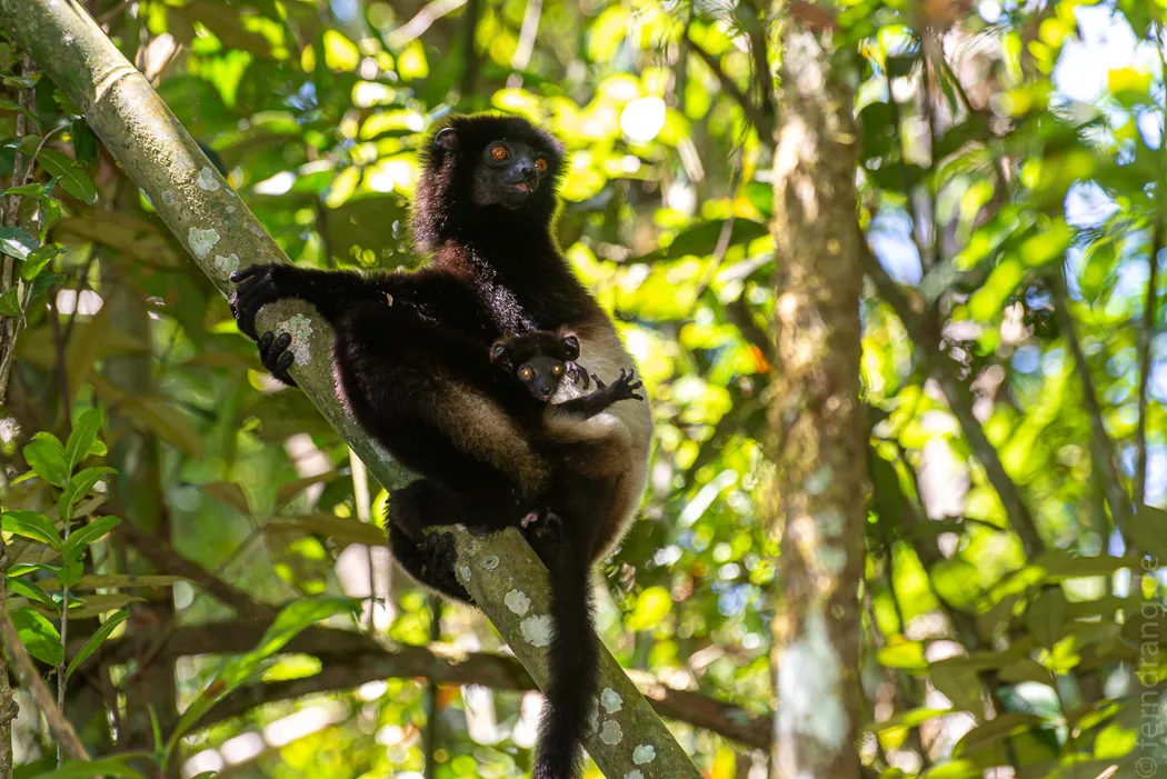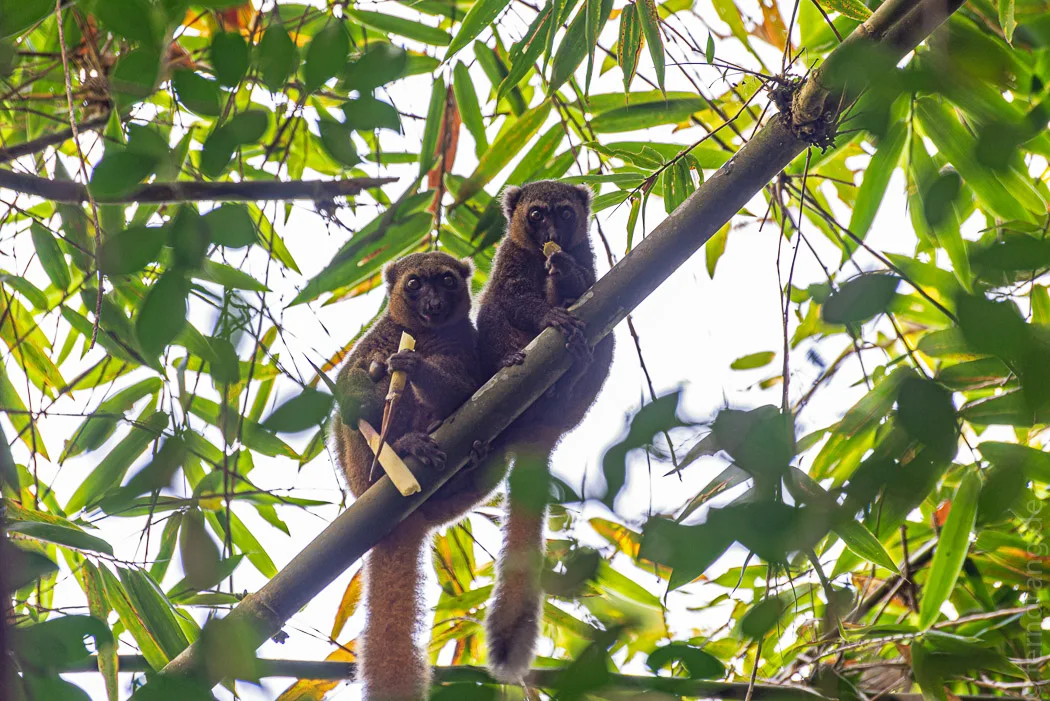 Doch auch die Lemuren ließen nicht lange auf sich warten. Chantelles Handy klingelte, und nach ein paar Ahas und Hms ist sie in irgendeine Richtung quer durchs Unterholz losmarschiert. Ihre Späher hatten den goldenen Bambus-Lemur (oder „Lemührr“, wie sie hier sagen) entdeckt. Das ist eine der niedlichsten Arten, falls solche wertenden Abstufungen überhaupt erlaubt sind. Herzerweichend haben sich zwei Lemüren einen Bambus-Snack geteilt.