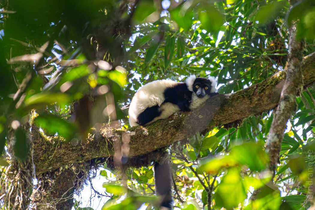 Und so ging es einige Stunden und einige Lemurenarten weiter. Insgesamt sechs Arten haben die Führer aufgetrieben. Für eine Gruppe von Sifaka-Lemuren mit einem Neugeborenen hat Chantelle uns fast rennend in eine etwas entlegenere Ecke des Walds gejagt. Dort ist die Gruppe auch noch einen steilen Hang hinauf gehüpft. Ohne Rücksicht auf Verluste sind die Späher mit uns hinterher. An morschem Bambus und durch knietiefes Laub und Unterholz sind wir hochgestolpert. Letztendlich sind wir aber dadurch belohnt worden, den schönen Tieren ganz nah ein wenig beim Mittagessen zusehen zu dürfen.