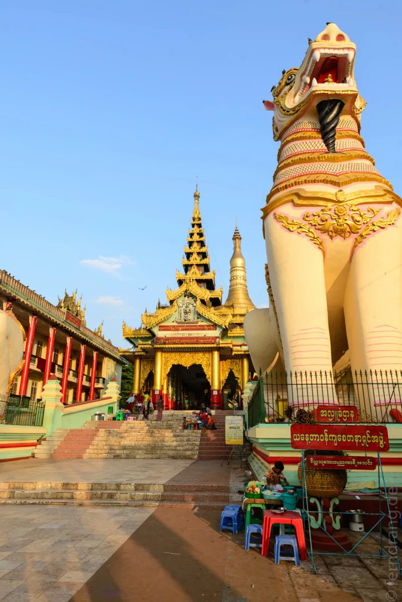 Die Attraktionen des Ortes sind die zahlreichen aber weitestgehend glanzlosen Tempel und heiligen Stätten. Da gibt es einen großen liegenden Buddha in einer Halle mit Bahnhofsatmosphäre. Hundert Meter weiter wurde erst neulich – gute Idee! – ein noch größerer liegender Buddha gebaut. Dann noch eine echt große, goldene Stupa (Landeshöhenrekord), haushohe Buddha-Gesichter und die Schlangen-Pagode. Letztere liegt malerisch hinter einer Müllkippe und beherbergt einen meterlangen, fetten Python, so dick wie ein Oberschenkel, dem gespendete Geldscheine in glückbringender Weise auf den Leib gelegt werden.
