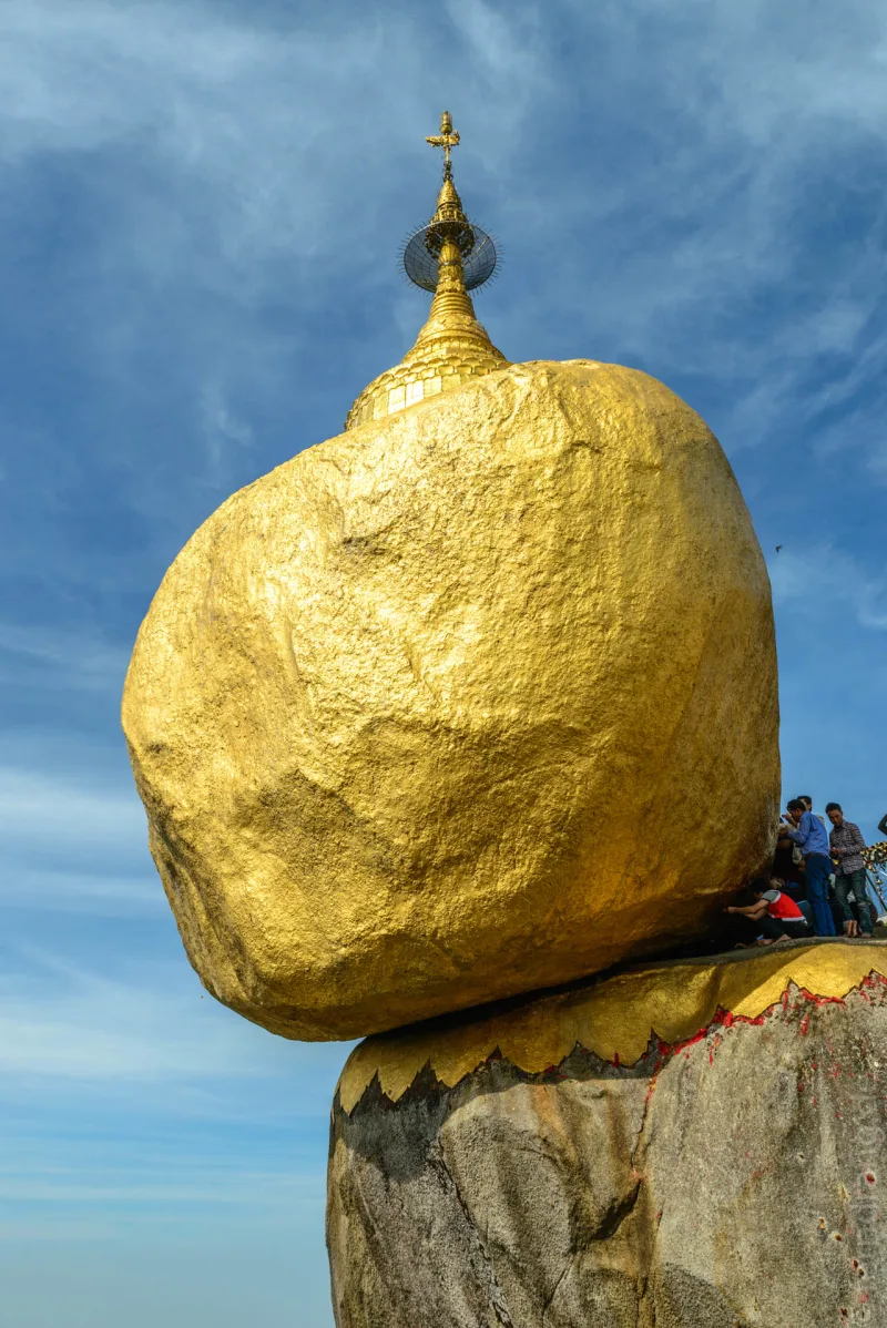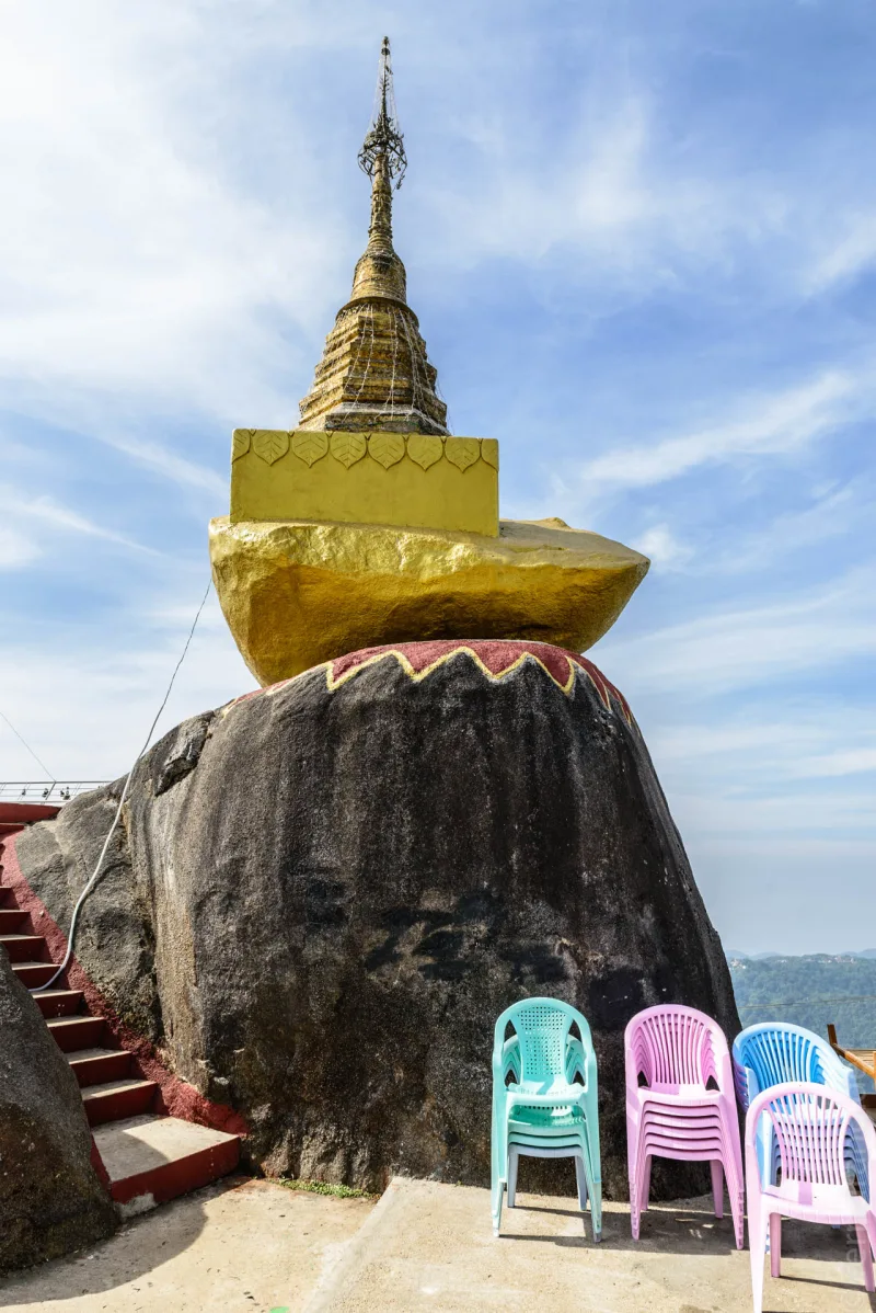 Oben angekommen ist von Heiligkeit nichts zu spüren. Um den Goldenen Fels herum ist eine große Plattform gebaut worden, die Mengen von Pilgern aufnehmen soll. Die Anlage gleicht einer improvisierten Zeltstadt, da viele die Nacht hier verbringen. Mit Decken und Schnüren werden Nachtlager gebaut. Mittendrin, fast unscheinbar hockt der Golden Rock – gehalten nur von Buddhas Haar – auf seinem schiefen Sockel. Tief würde er nicht mehr fallen, da mittlerweile eine weitere Terrasse direkt darunter gebaut wurde.