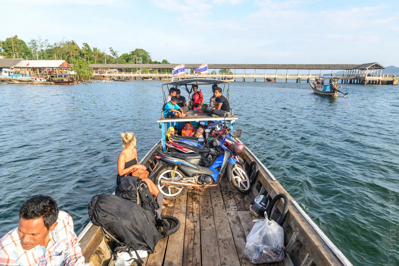 Wir verlassen unser Ei nur ungern – aber nichts könnte uns in Ao Nang halten. Die Fähre von Krabi nach Ko Lanta macht auf halbem Weg einen Stopp auf dem Meer vor der kleineren Insel Koh Jum. Longtailboote der Resorts kommen zur Fähre und nehmen die Passagiere mit. Dabei herrscht an Deck großes Getummel, weil sowohl Waren auf die kleinen Boote geladen werden, als auch Abreisende an Bord kommen. Jetzt wird klar, warum die ganze Fähre beim Einsteigen mit viel Mühe nach Ausstiegsreihenfolge sortiert wurde.