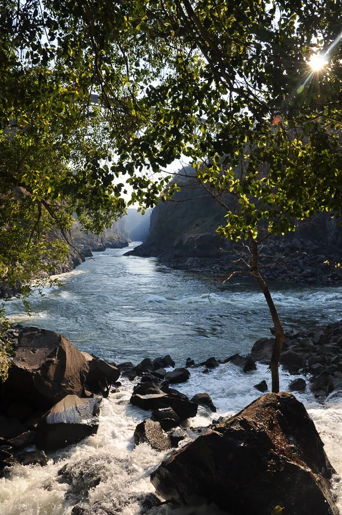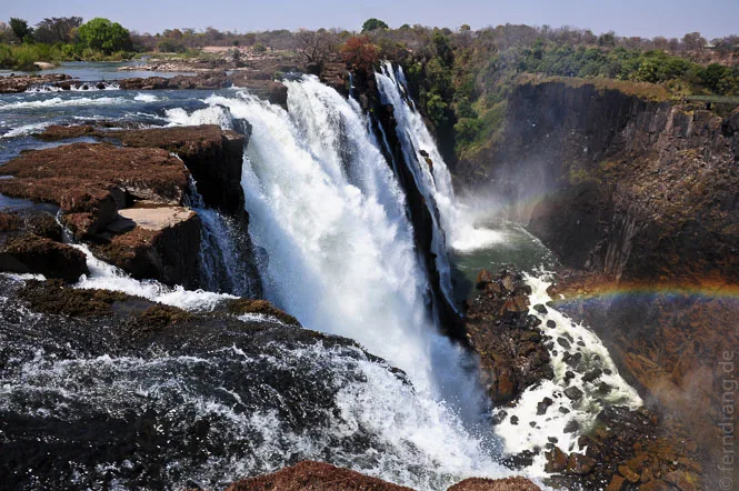 Einen noch beeindruckenderen Ausblick auf die Fälle konnten wir jedoch bei einer improvisierten Tour mit einem einheimischen “Führer” erhaschen. Barfuß und mit hochgekrempelten Hosen haben wir uns im Krebsgang ein winziges Wehr entlang durch die flachen Wasser des Sambesi geschoben. Auf diese Weise gelangt man bis zur Mitte des Flusses und vor allem bis an die Kante der Fälle. Dort gibt es auch einen kleinen Pool, in dem man baden und bis zum Auslauf der Fälle schwimmen kann. 110 Meter senkrecht über der Schlucht konnten wir die Victoria Falls hautnah erleben - Regenbogen inklusive.