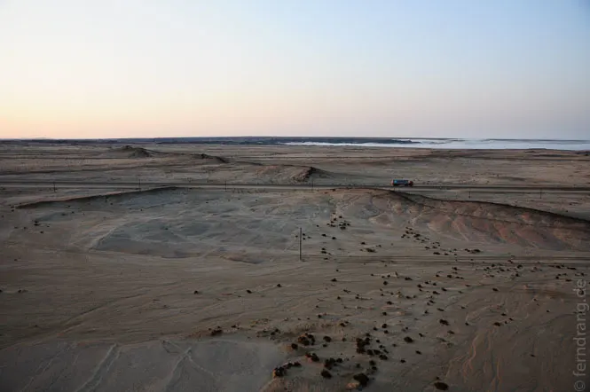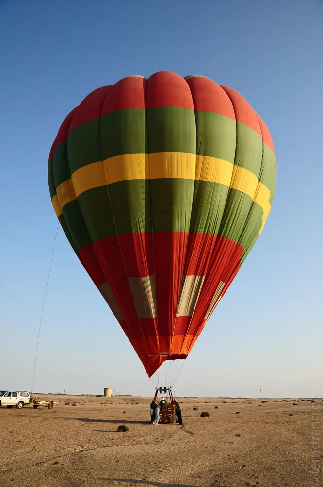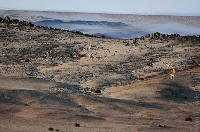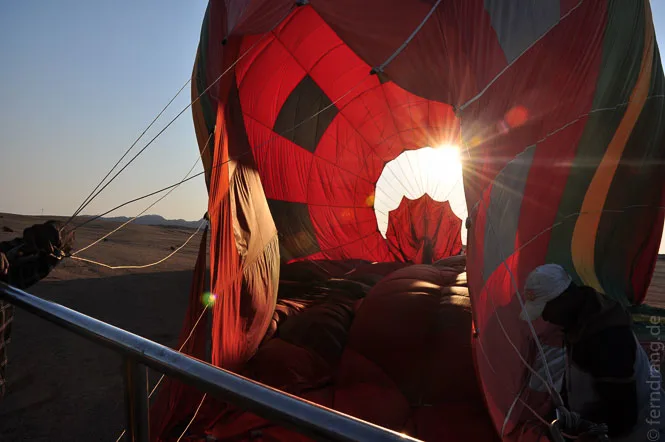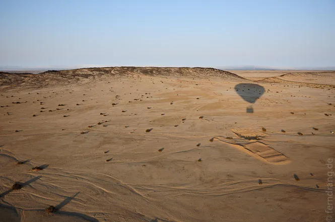 Als Höhepunkt unseres Aufenthalts haben wir eine kurze Ballonfahrt über der Wüste unternommen. Noch vor Sonnenaufgang sind wir abgeholt worden, um mit den ersten Sonnenstrahlen schon zu schweben. Könnte man die Richtung selbst bestimmen, wäre es die perfekte Art zu reisen. Laut- und schwerelos gleitet man dahin, und das immer ohne Fahrtwind. Mal sind wir 500 mal nur einen halben Meter über dem Boden geflogen und hatten dabei einen fantastischen Ausblick auf das Mondtal und den Küstennebel, der seine gierigen Finger in die Wüste streckt. Das Beste waren aber die ungläubigen Gesichter einer Handvoll Arbeiter, die wir mit dem Ballon in ihrer morgendlichen Trödelei aufgeschreckt haben. Aus ihren dunklen Gesichtern haben sie von Ohr zu Ohr gestrahlt. Anschließend gab es ein Sekt-Frühstück auf dem Anhänger - kein schlechter Start in den Tag. Und da diesmal auch Swakopmund etwas von der Sonne abbekommen hat, haben wir einen ganz gemütlichen Tag am Strand verbracht.