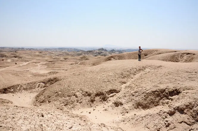 Der erste Ausflug war eine Wüstenrundfahrt auf dem Welwitschia-Drive. Auf einer holprigen Schotterpiste wird man an einigen unterschiedlich sehenswerten Stellen entlang geführt und wünscht sich einen Geländewagen. Vorbei an kaum sichtbaren Flechten, die dem Boden einen leicht grünlichen Schimmer verleihen, gelangt man zu einem Tal, das Mondlandschaft genannt wird. In der unglaublich trockenen Hitze, die einem wie ein Fön ins Gesicht bläst, kann man in die eindrucksvoll kargen Schluchten blicken.