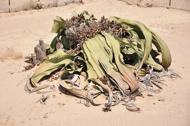 Seinen Namen hat der Rundweg aber von der Hauptattraktion, der Welwitschia Mirabilis. Das ist eine dubiose, zweihäusige Wüstenpflanze, die aussieht wie ein gigantischer, alter Salat und dabei nicht besonders ansehnlich ist. Höhepunkt der Fahrt ist ein 1500 Jahre altes Exemplar, das eingezäunt in Gefangenschaft gehalten wird. Von einer kleinen Brücke aus, kann man ungläubige Blicke auf den meterbreiten Sonderling werfen.