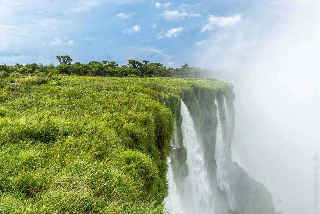 Wir hatten aber noch etwas Zeit zum trocknen, da wir uns den Höhepunkt des Parks bis zum Schluss aufbewahrt hatten. Ein über einen Kilometer langer Steg führt über zahlreiche winzige Inseln in die Mitte des Flusses und endet direkt an der Kante des „Teufelsschlunds“, den Hauptfällen. Dort herrschte zwar ziemliches Gedränge, aber durchaus zu Recht. Der Blick in die weiße Hölle ist atemberaubend - und das dazu gehörende Getöse auch. Wir konnten uns kaum sattsehen.