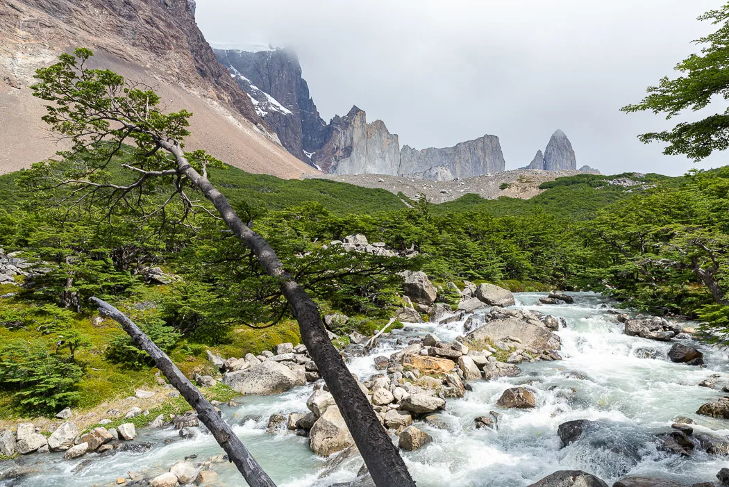 Zuerst hieß es jedoch laufen. Das „Refugio Chileno“ war in zwei Stunden erreicht. Danach tauchte der Weg in einen hübschen Wald ein und wurde etwas spannender. Bis zum Abzweig zum Mirador dauerte es nicht lange, doch die letzte Meile ging ziemlich steil einen Geröllhang hinauf. Mit jedem Meter wurde der Wind stärker, bis er uns fast umgeworfen hätte. Das hat letztlich die Aussicht erledigt. Hinter dem Geröll liegt eine türkisgrüne Lagune, über der die drei Türme wie die Rückenschuppen eines riesigen Drachen hoch aufragen. Von den Seiten fallen sandige Hänge steil in den See, in den beständig Schmelzwasser aus kleinen Schnee- und Eisfeldern rinnt. Ein fantastischer Anblick! Leider wollten die Wolken die Spitzen der Türme nie ganz freigeben.