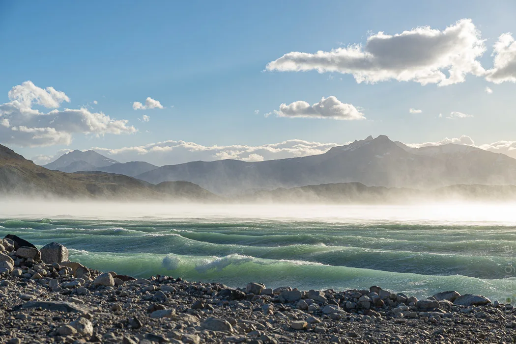 Nach dem Frühstück sind wir nach Norden zum „Refugio Grey“, dem letzten Camp auf der W-Route, aufgebrochen. Der Weg schlängelte sich zwischen Hügeln langsam hinauf, bis endlich der Lago Grey in Sicht kam. Die Fluten waren tatsächlich recht grau, insbesondere verglichen mit den grün schimmernden Seen der vorigen Tage. Was den Reiz des Sees ausmacht, ist die große Gletscherzunge, die am Nordende in den See mündet. Vielmehr erzeugt der Gletscher den See. Der Wind blies heftig und trieb blau funkelnde Eisberge vor sich her, die sich in den Buchten des Sees sammeln. Auf den Aussichtspunkten bekamen wir die Augen kaum auf und wurden von Böen durchgeschüttelt.