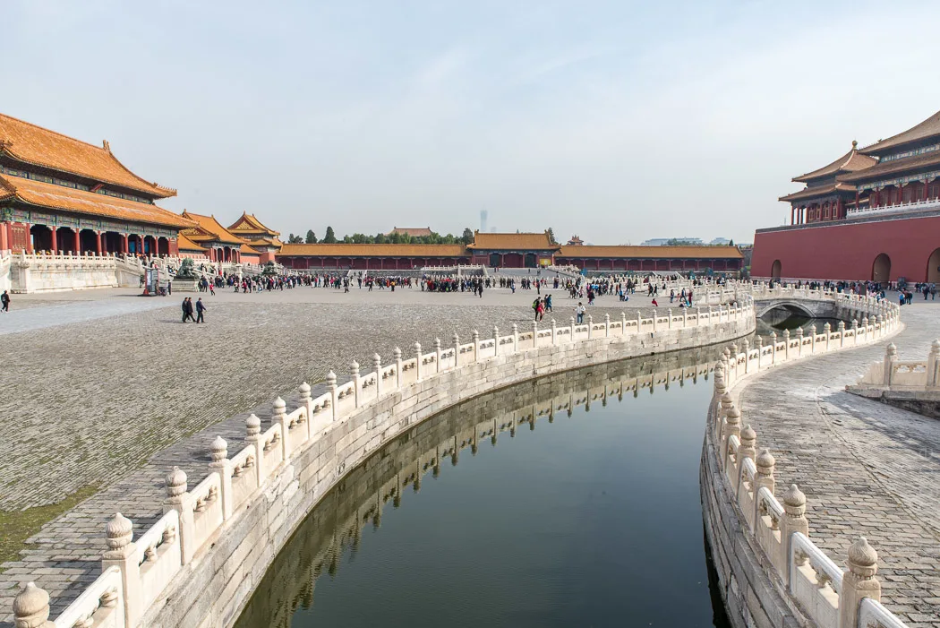 Dahinter wiederholt sich das mit weiteren Höfen und weiteren Toren, bis man am Nordende wieder ausgespuckt wird. Durch einen besonders schönen Hof wird ein Kanal in einem Bogen geleitet, über den fünf Brücken führen. Man kann sich vorstellen, dass Bittsteller und Vasallen in jedem Hof ein bisschen kleiner wurden, bis sie kriechend vor dem Kaiser ankamen.