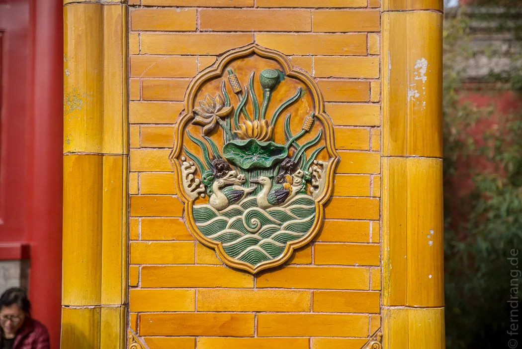 Die Dächer sind mit orangen Kacheln gedeckt und die Wände rot lackiert. Auf den Ecken der geschwungenen Dächern sitzen „Dachwächter“, meistens Drachen, Löwen oder andere Tiere, die in China nicht mehr so häufig anzutreffen sind. Neben der Hofachse gibt es mehrere Straßenzüge mit allerlei kaiserlichen Wohnhäusern. Der Aufbau erinnert an die Kaiserstadt Hue in Vietnam, die hier allerdings in einen der Nebenhöfe passen würde. Die Anlage ist ziemlich beeindruckend aber wegen der Ausmaße und der Eintönigkeit, auch ermattend - das hat man davon, wenn man ein Design durchzieht.