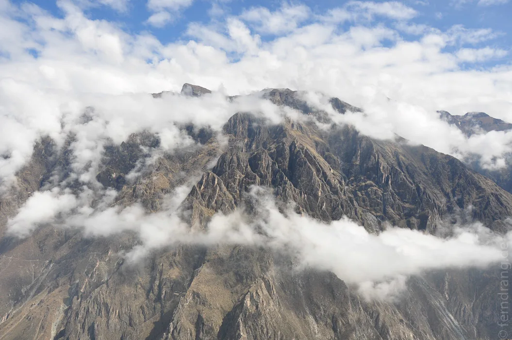 Nach der obligatorischen Fahrt durch das Niemandsland, das Arequipa umgibt, haben wir nach Stunden den Cañon erreicht. Im unteren Bereich ist es noch grün und fruchtbar, während es an den Hängen immer karger und später auch verschneit wird. Der erste Stopp war das Cruz del Condor - ein Aussichtspunkt, von dem aus man Kondore beobachten kann. Wir haben leider keine gesehen. Dafür konnten wir die Wolken, die weiter unter uns im Tal am laufenden Band produziert wurden, an uns vorbeisteigen sehen, was auch ein toller Anblick war.
