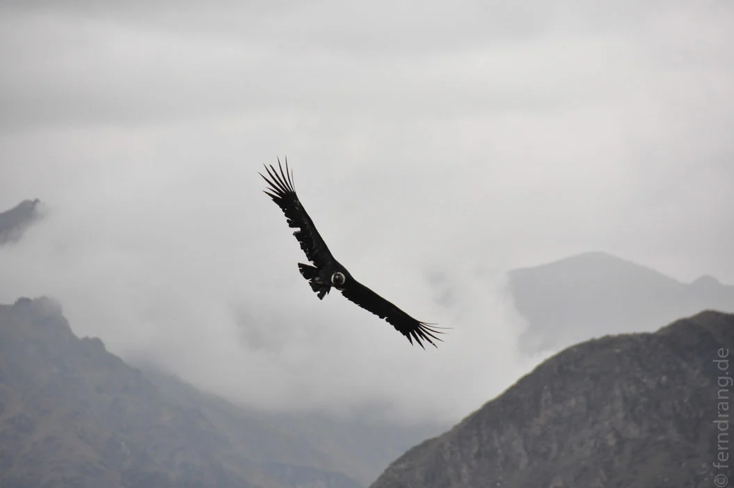 Nachmittags haben wir die Wanderung mit dem Abstieg ins Tal begonnen. Vom Städtchen Cabanaconde aus liegt der Talboden etwa 1.000 Höhenmeter tiefer. Über einen steilen Pfad, auf dem es immer wieder zu Staus mit Eseln kam, ging es hinab. Hier haben wir dann doch noch Kondore sehen können, die um uns herum gekreist sind. Leider hat es auf halbem Weg angefangen zu regnen und nicht mehr aufgehört. Bei Ankunft in der ersten Unterkunft waren wir und alle unsere Sachen schon vollkommen aufgeweicht.
