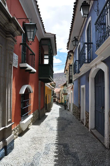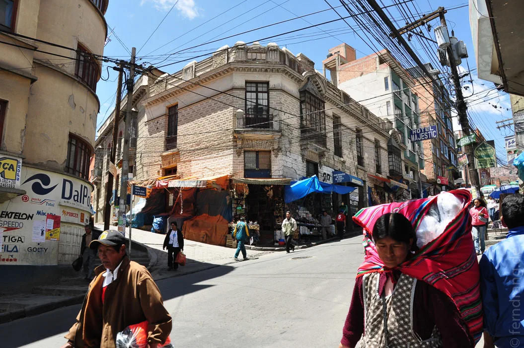 Bei unserem ersten Rundgang durch die Stadt haben wir die Höhe dann richtig zu spüren bekommen. Keine Straße ist hier ebenerdig. La Paz erstreckt sich über einen großen Talkessel, an dessen Rändern sich unverputzte Häuser wie Taubenlöcher ausbreiten. Das Gelände ist so wild zerfurcht, dass es mitten in der Stadt Steilklippen gibt. Man kann um einen Block gehen und dabei nur bergauf gehen - den Stadtplan hat Escher entworfen.